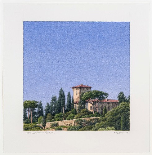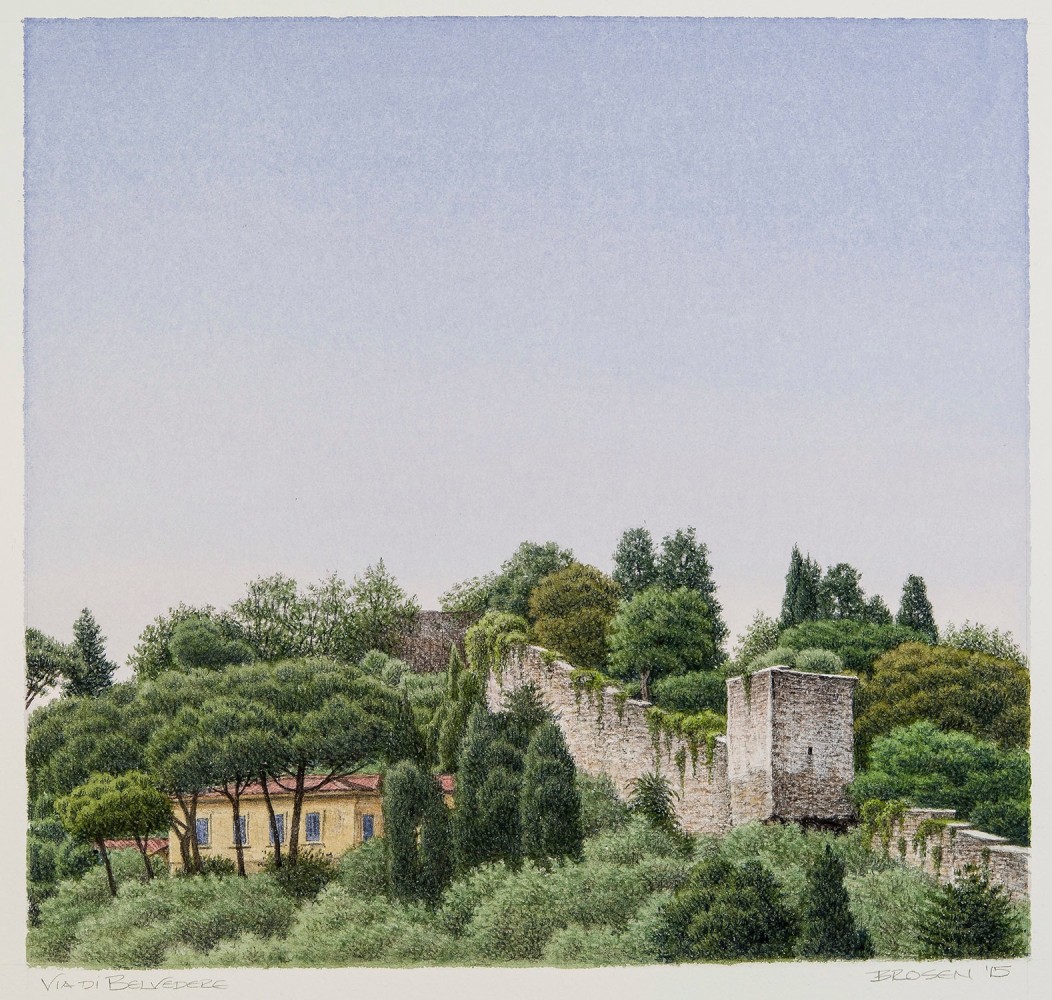 Frederick Brosen, one of America’s finest watercolor artists. These striking works are infused with the architectural romance of New York City. By focusing on the time of day around him and the city, Brosen brings an awareness of New York as a place of history and limitless experience. At dawn, Brosen travels on his bike in quest of new subjects, when the streets are devoid of the hustle-bustle of daily metropolitan life. With painstaking care and commitment, he sketches a scene, photographs it, and sketches again. Finally painting, Brosen builds his color by starting with light washes and adding layer after layer of rich tone. The results are crystalline and sophisticated images that reflect each location through the intimacy of countless details. There is a haunting familiarity about these cityscapes, whether you’ve seen the views they depict many times or never before. They are the iconic views of New York. Brosen looks for places where incredible streetscapes have created themselves, from Central Park to SoHo, where factories, garages, churches, and homes sit side-by-side along a side street; where mosques, temples and churches and banks coexist with skyscrapers, carriage houses and tenements. He finds sculptural ornaments and classical scrolls, gargoyles, cornices and signs, wrought iron and water towers. These components reveal that there is still an old New York that coexists with the new. A native New Yorker, Frederick Brosen began his studies at City College of New York, graduating in 1976. He studied art at the Art Students League and at Pratt Institute, receiving his MFA from Pratt in 1979. Mr. Brosen has been recognized with a Silver Medal of Honor by the Royal Society of Arts & Letters in London and a Pollock-Krasner Foundation Grant. Watercolors by Frederick Brosen have been acquired by the New York Historical Society, the Knoxville Museum of Art, The Museum of the City of New York, Frye Art Museum (Seattle) and the Metropolitan Museum of Art and are in many private collections.