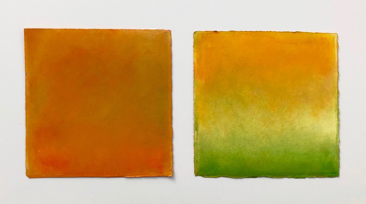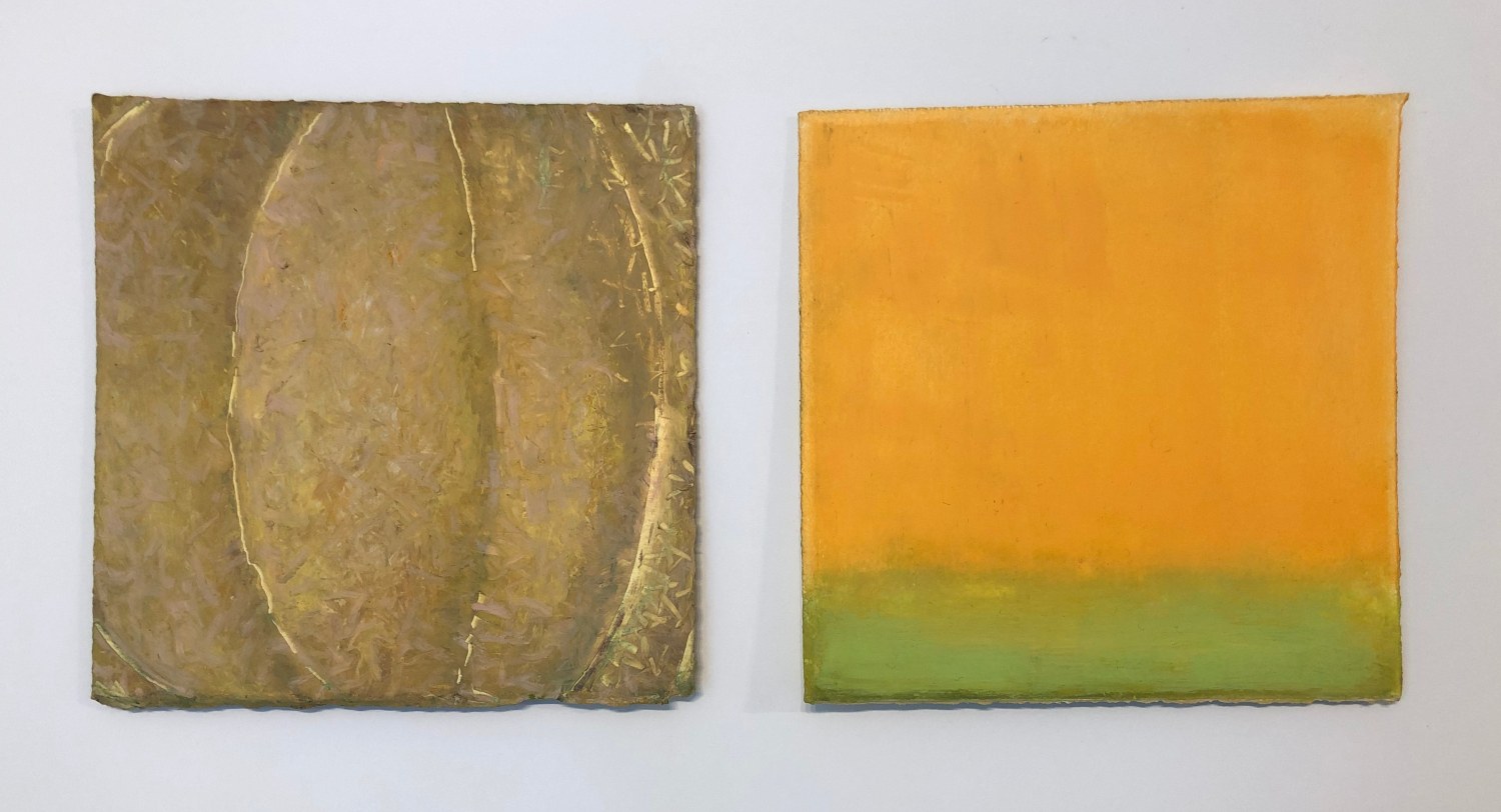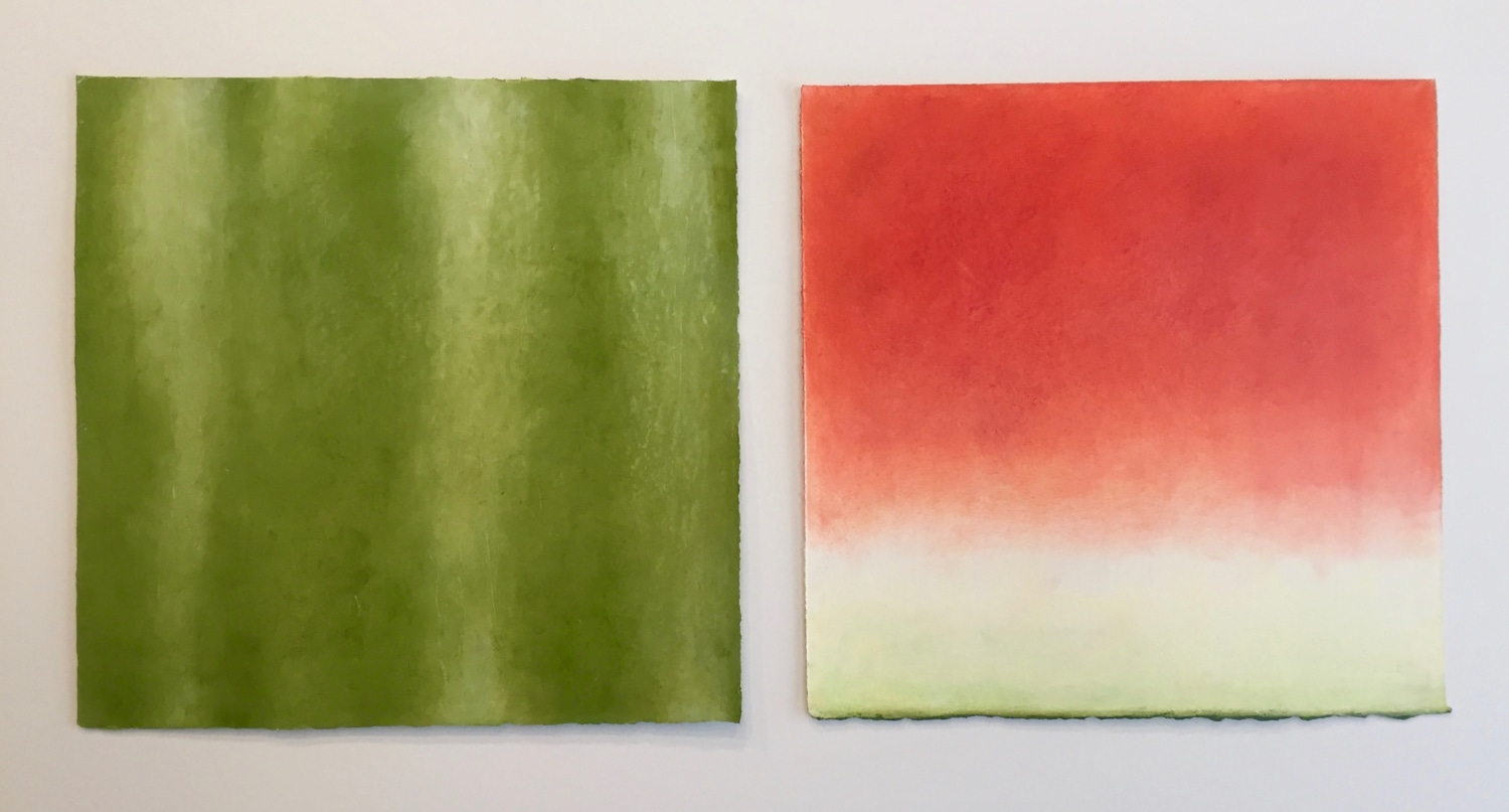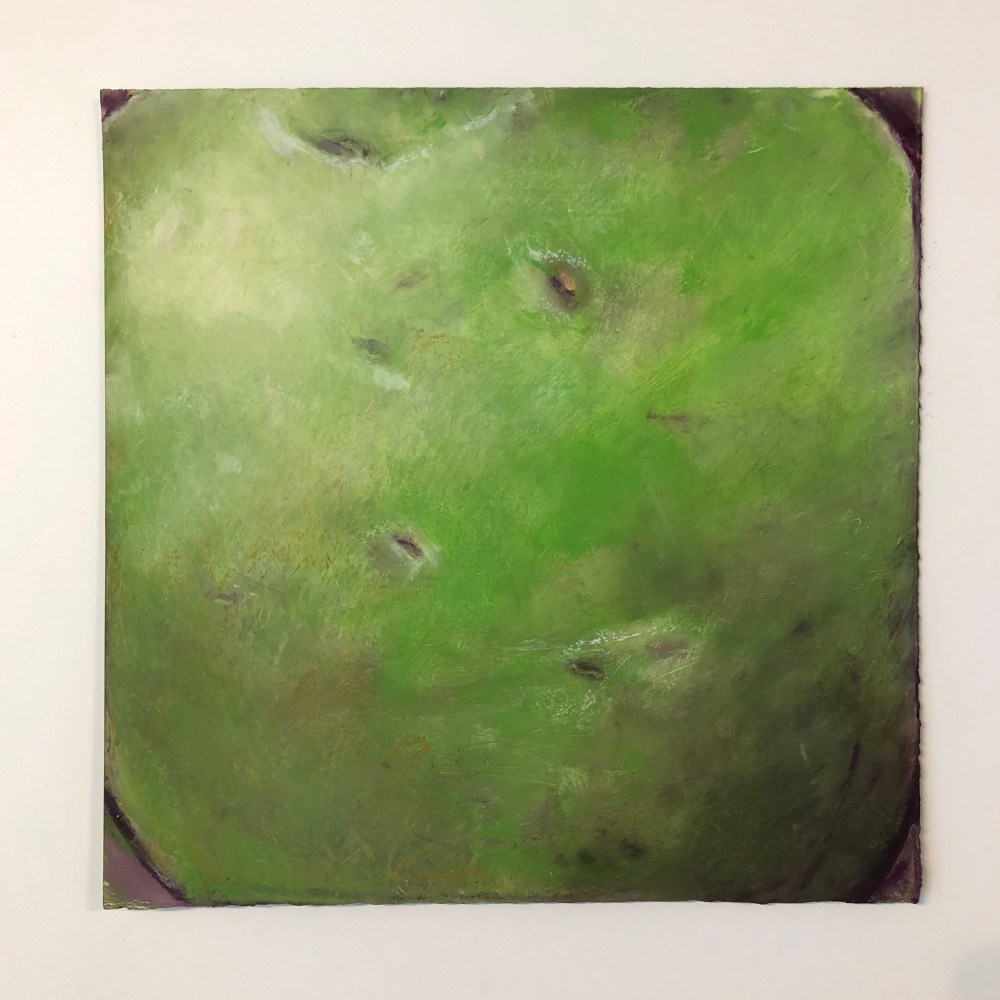 Craddock explores new scales and sizes in her recent pastels. In addition to her standard square-foot format, she has added smaller, study-sized pairings, and more commanding, large-scale sets to her oeuvre. The demure, half-sized scale offers an intimate view of her subjects, suggesting a close and contemplative practice. Craddock saturates these smaller studies with dramatic color shifts and deliberately executed gradients, visualizing the flavor packed into her produce. The expansiveness of Craddock’s new, larger scale becomes a playground for form and volume. Opaque striations map out furrows and crests, transforming the plane into sensuous cartography. Ever interested in the tactility of her “sitter,” Craddock captures not just the two-dimensional landscape of its surface, but the curvatures of its body, as well. Craddock’s saturated colors are redolent of the smells and tastes of summer, however their smooth surfaces belie much layering and scraping away below. These works are intended to be experienced at the edge of description and abstraction.