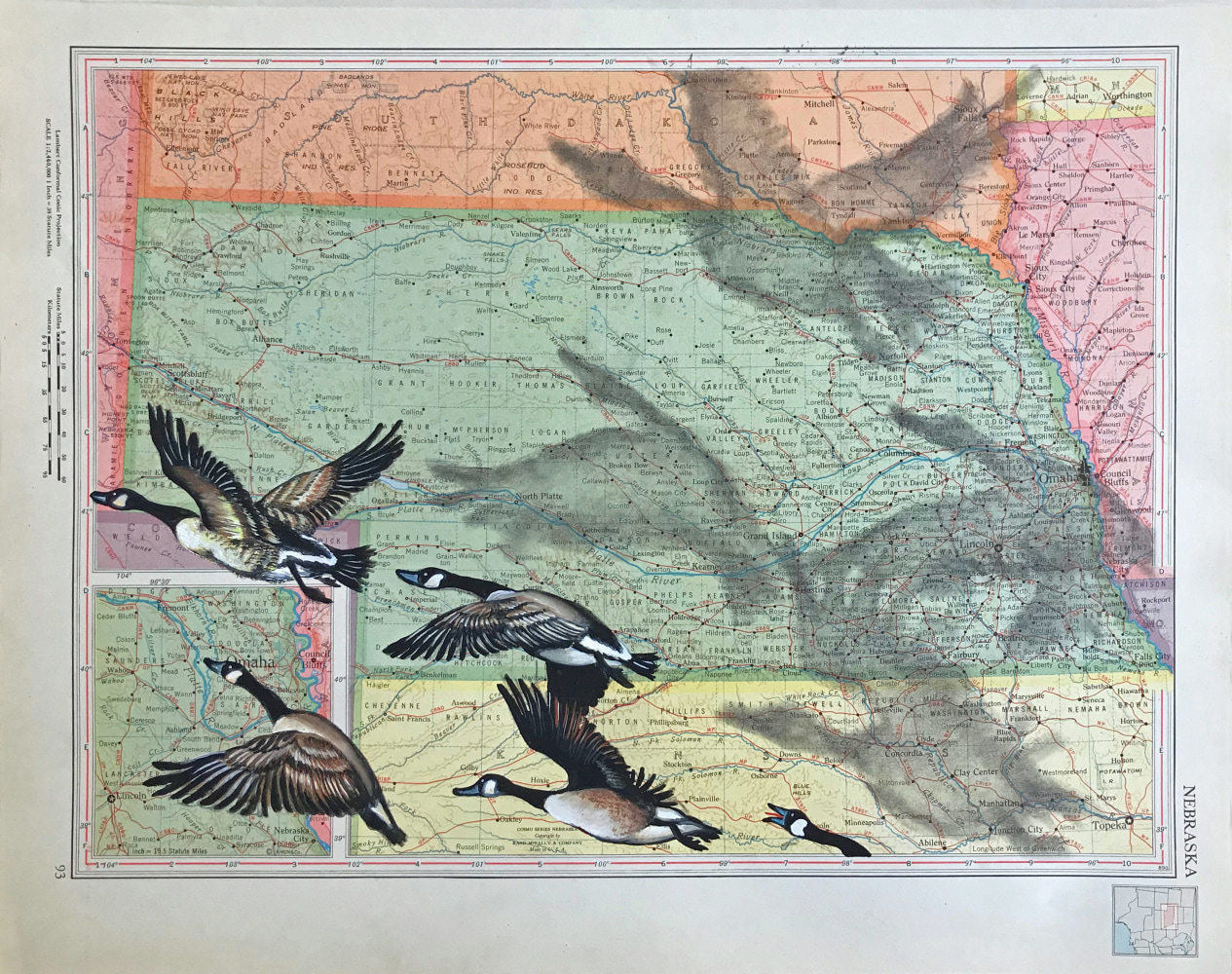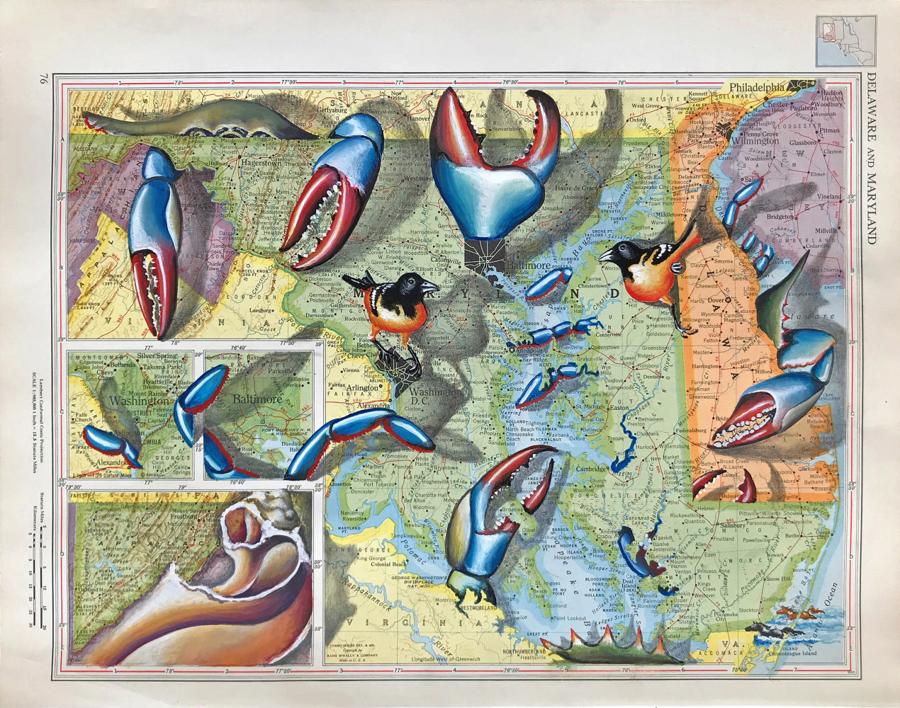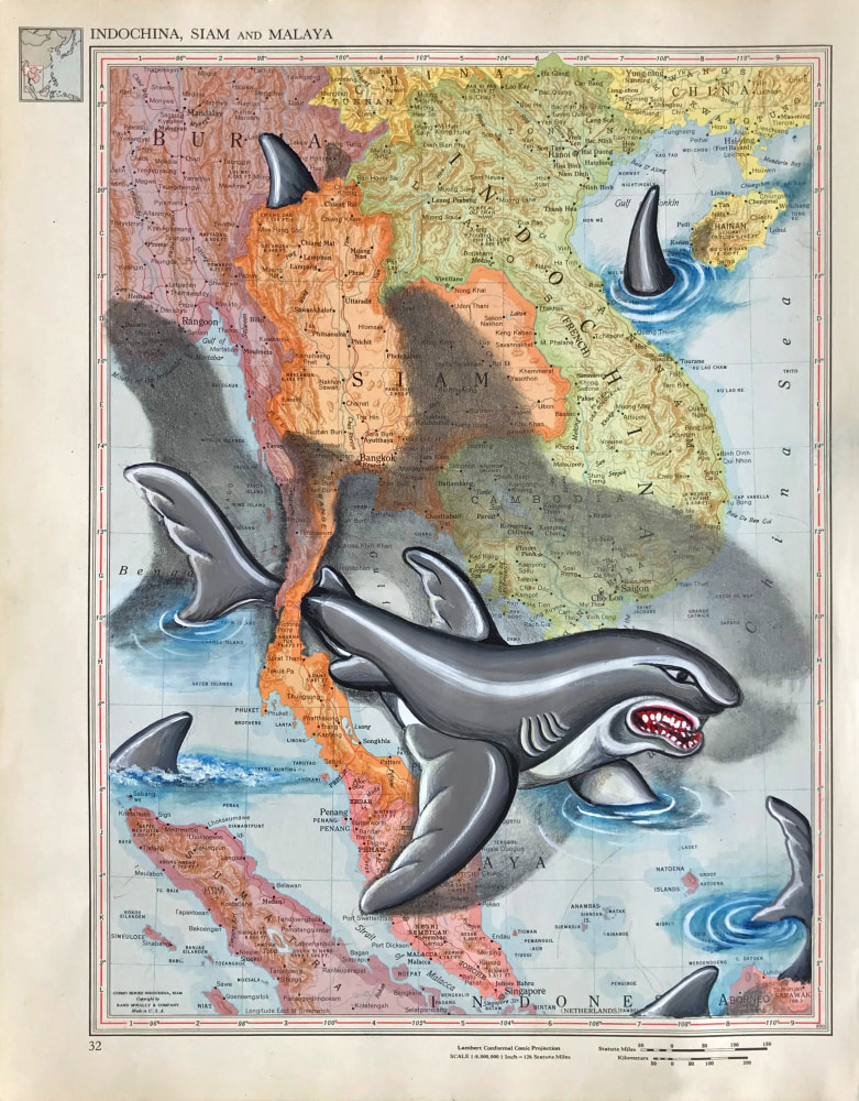 Incorporating vintage pages sourced from a 1946 Rand-McNally World Atlas, Carol Wax’s ongoing Map series addresses the void between natural and political borders. Rendered with dramatic lighting effects and exaggerated perspectives, her images evoke societal mythologies and psychological narratives that portray both humor and menace. Age-old hostilities between Ukraine and Russia are rendered through familiar symbols rather than disputed land. The tiny poisonous dart frogs of Colombia’s jungles serve as emblems of the country rather than its rivers and cities. Related animal life populate other land masses, giving a tongue-in-cheek clue to location. Carol Wax has exhibited widely since the early 1980s and has been awarded the Individual Support Grant from the Adolph and Esther Gottlieb Foundation, Inc., two Artist Fellowships from the New York Foundation for the Arts, a Concordia Career Advancement Award from NYFA, The Louise Nevelson Award for Excellence in Printmaking from the American Academy of Arts and Letters, and residencies at The MacDowell Colony and Marie Walsh Sharpe Art Foundation's Space Program to name a few. Her work can be found in numerous museum collections such as The Metropolitan Museum of Art, The Brooklyn Museum, The New York and Boston Public Libraries, The Philadelphia Museum of Art, The Library of Congress, and The National Museum of American Art, Smithsonian Institution.
