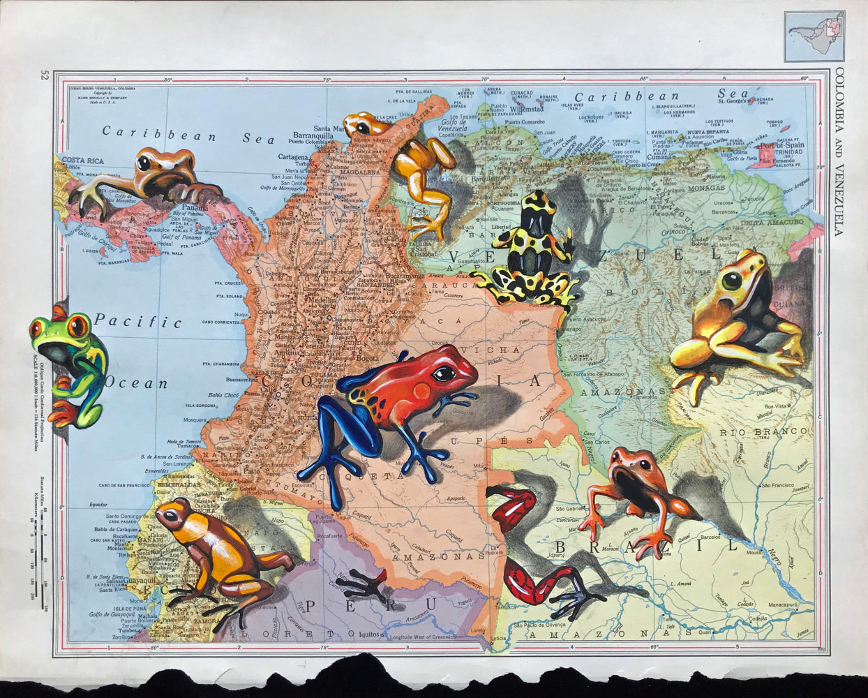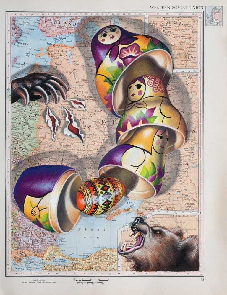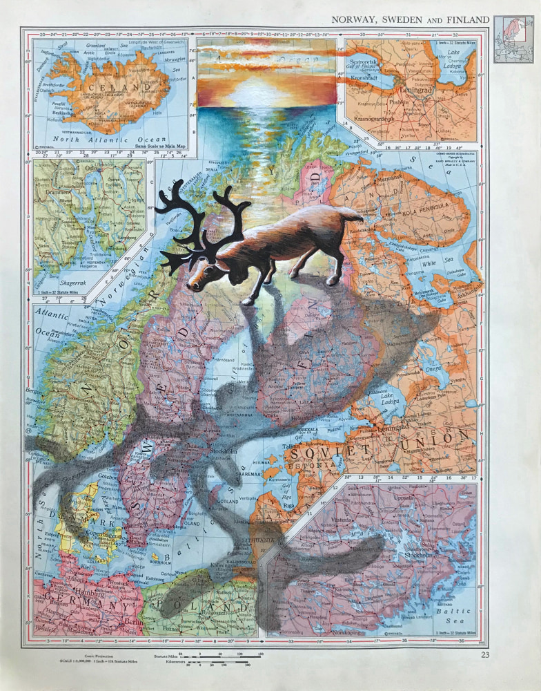 My ongoing series of mixed-media works incorporating maps addresses the void between cartography and atlases of emotions. In the accompanying selection of images, age-old hostilities between Ukraine and Russia are best rendered through cultural symbols rather than disputed borders. I find the tiny poisonous dart frogs of Colombia’s jungles more emblematic of the country than its rivers and cities. An unrealistic fantasy of moving to Lapland to herd reindeer makes Finland more real to me than names of towns I can’t pronounce.