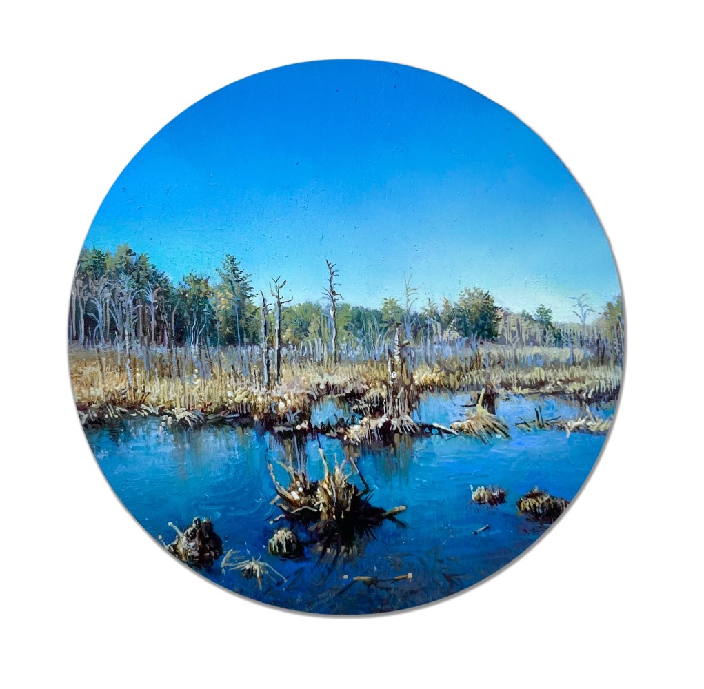 Dina Brodsky is a contemporary realist painter. Known for her miniaturist style, her highly detailed depictions of urban interiors, natural environments, and unsuspecting human and animal subjects are evocative of renaissance portraiture and landscape. Brodsky often paints on small circular surfaces, forcing viewers to move closer to the work. She was drawn to miniature painting from her study of Islamic miniature art and medieval illuminated manuscripts, whose techniques she combined with those of classical painting. She is amongst a group of contemporary realist painters, such as Timothy Barr and Hollis Dunlap. Born in 1981 in Minsk, Belarus, she moved to the United States at the age of 10, and received her BFA at the University of Massachusetts in Amherst and an MFA from the New York Academy of Art in 2006. Dina has had solo exhibitions in London, New York, Massachussetts, and Florida. She has taught in several institutions, including the Castle Hill Center for the Arts, the Long Island Academy of Fine Art, and the Metropolitan Museum of Art.