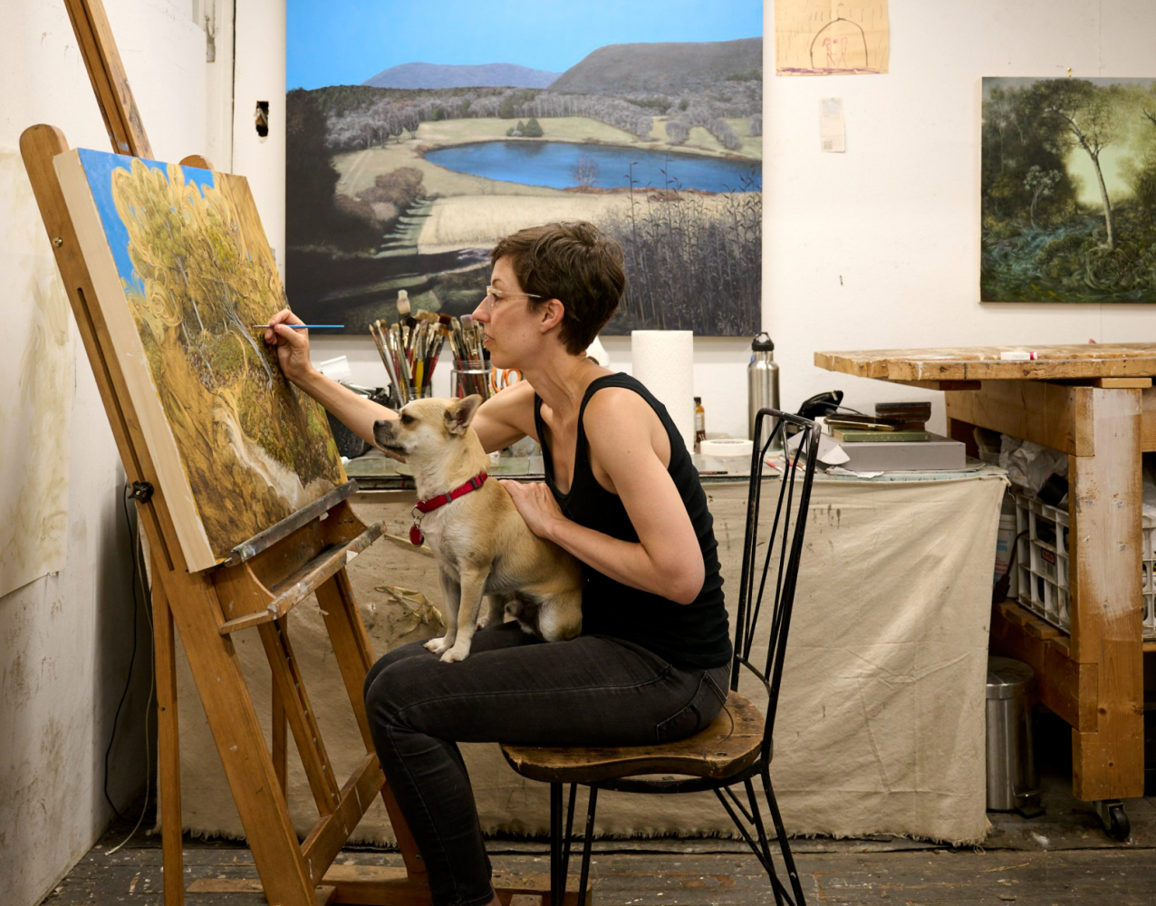 Eileen Murphy has spent her life along the Hudson River and has lived in Brooklyn, NY for the last seventeen years. Her current paintings are based on the landscape of Columbia County, NY, where she and her dog Frito spend part of their time. Eileen has shown widely and has attended residencies to the Vermont Studio Center, Yaddo, and the High Line 9. She received the Individual Artist Award from the Santo Foundation in 2017; in that same year, she was invited by the US Department of State to participate in the Art in the Embassies program, which brought her to Algeria. She is currently the Lead Faculty in Drawing, Painting, and Printmaking in the MFA program at the Institute of Art and Design at New England College. Her most recent solo show in New York City was at Sears Peyton Gallery in Chelsea in January 2022.