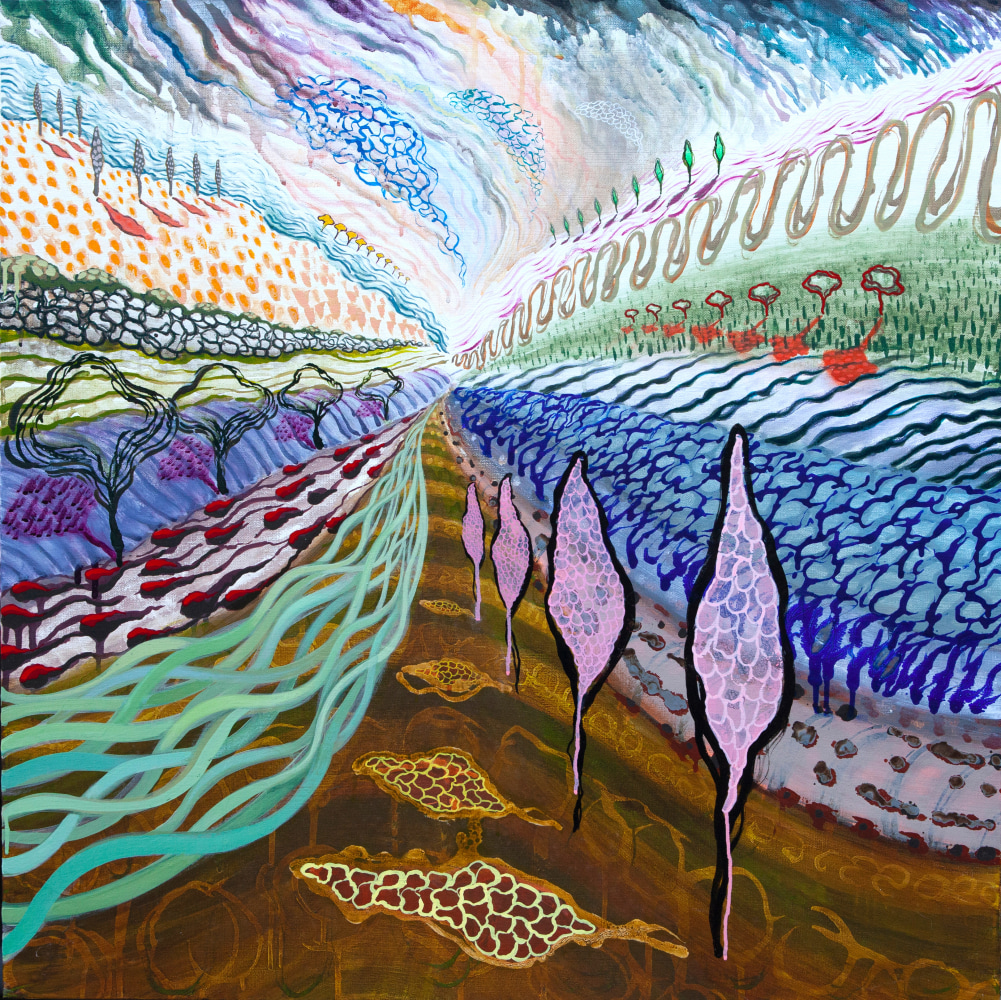 My work combines perception in the moment, memory of past space and aspiration of future place. The American west, Italy and New York's Hudson Valley are among the places I explore. My drawings function as research for studio works that are either watercolor and gouache, acrylic, marker or oil pastel. My travel research of plein air drawing combines with invented imagery back in my studio. The combined elements from all the landscapes I explore allows me to create new worlds and vistas that feel familiar, fresh and surprising. New York’s Hudson Valley contributes distant mountains and rows of corn fields; the landscape of Italy’s Crete Senesi and Lago di Como’s mountains has given my work the twisting, intertwining, ordered, pattern-infused hills; the American west’s flora and endless, open space has given my work an intensity of light and color as well as a sense of temperature and limitless, expansive possibility. My observational gesture meets abstract, patterned mark-making, creating an ordered chaos of the natural world.