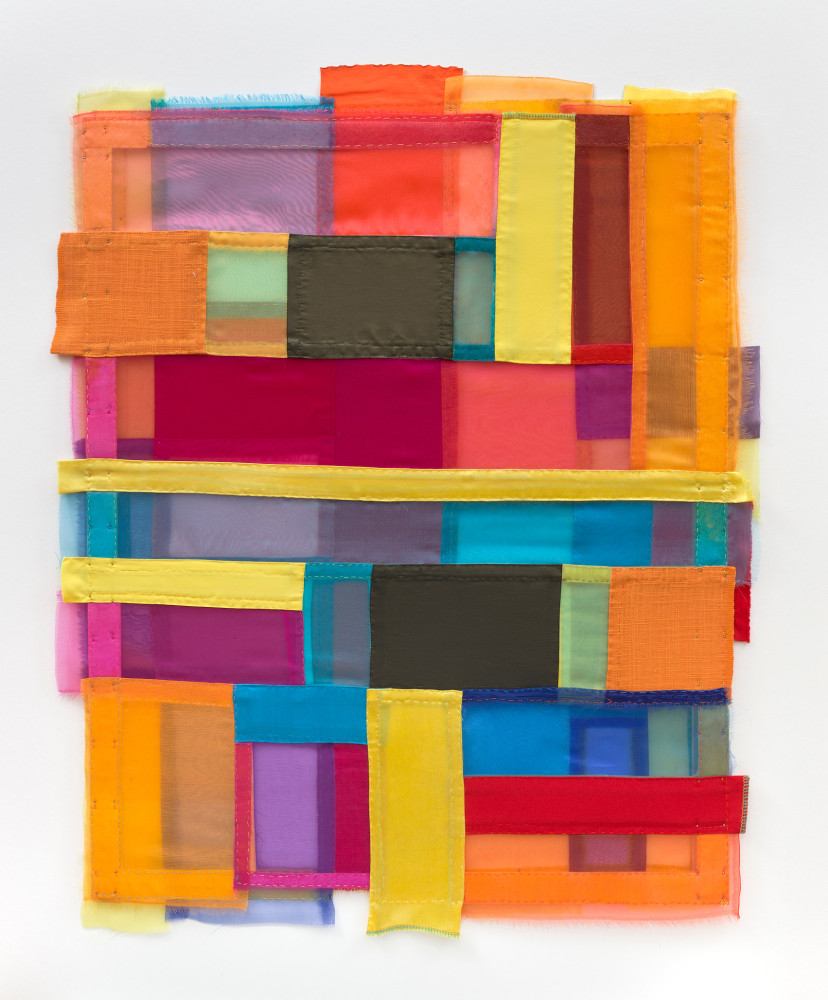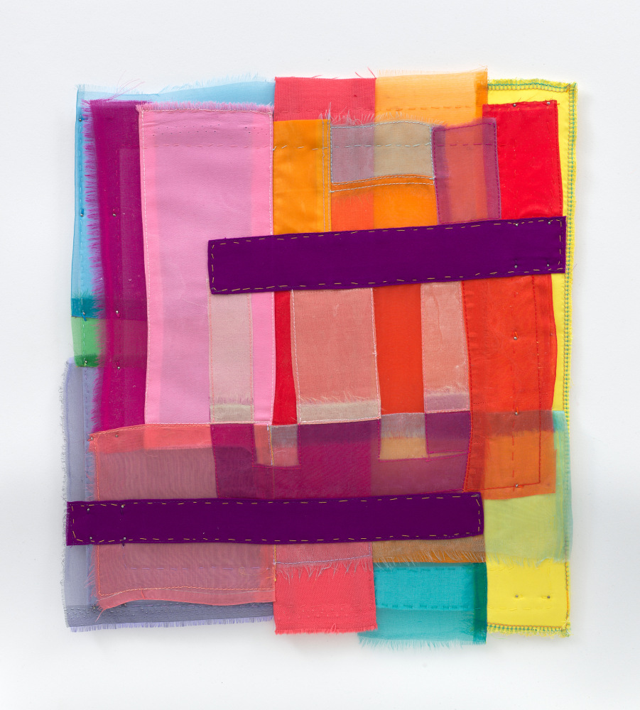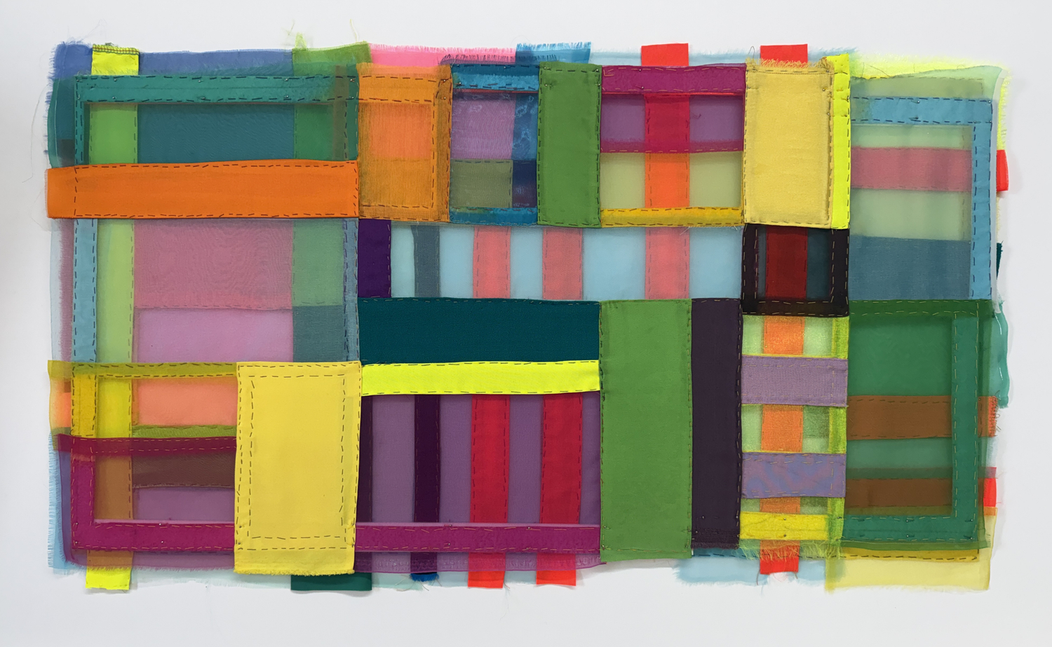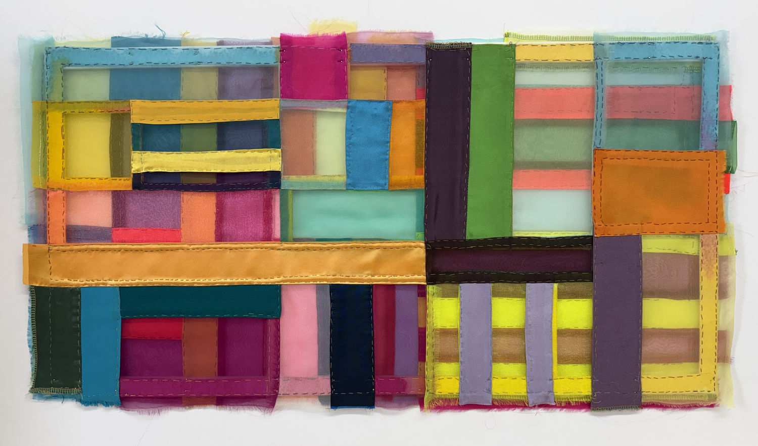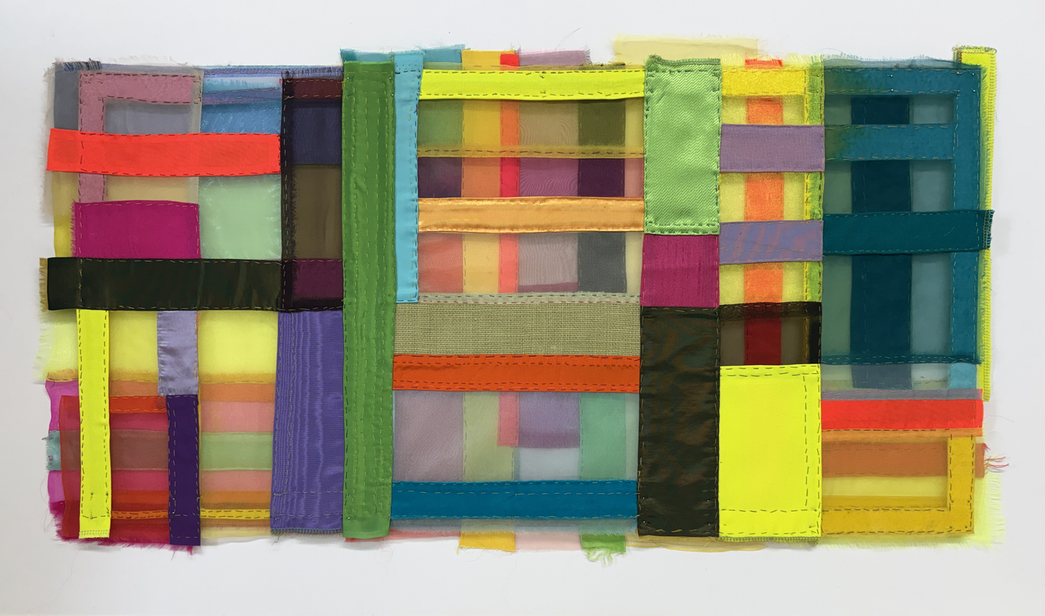 I am inspired by the colors and textures of transparent and opaque fabrics I collect and sew into layered, geometric collages. The construction of each piece is a journey. Through my stitching methods and varying degrees of fussiness, I explore and challenge expectations of perfection, the rigidity of traditional rules, and what has historically denoted success for women. Everyone has a relationship with fabric, so the colors, textures and types of fabric used in the work stir up personal memories of childhood, special events, personalities, lifestyles, ethics, privilege and wealth. My fabrics range in cost and quality from thrift store finds and bargain bin remnants to high end silks. The stitching is done both by machine and by hand, sometimes neat, sometimes unpredictable and haphazard. The fabrics are often frayed, ripped apart and reassembled, leaving holes that expose a trail of my process.