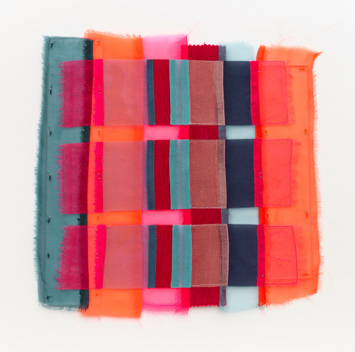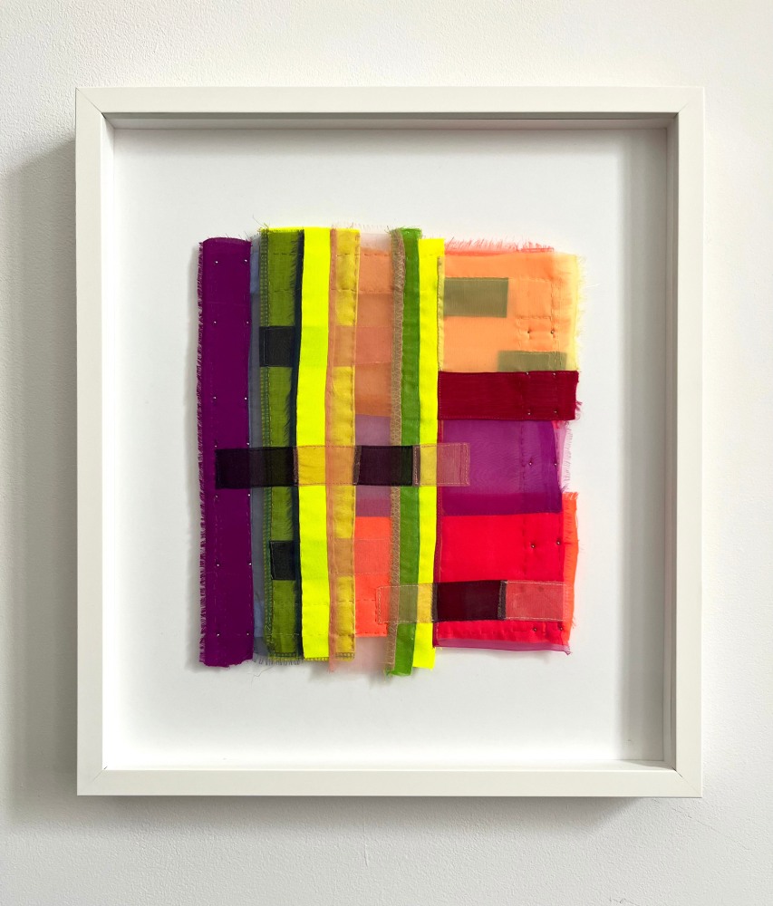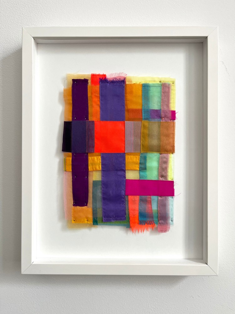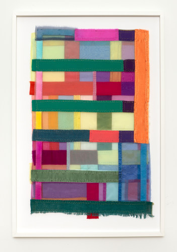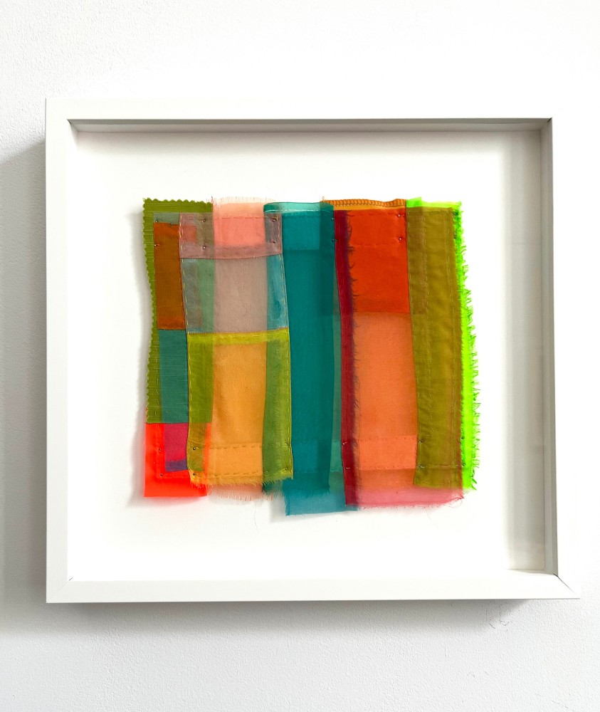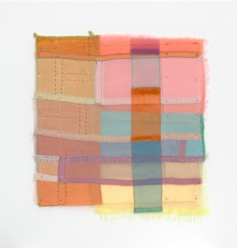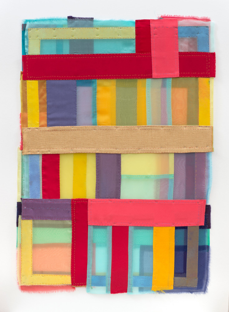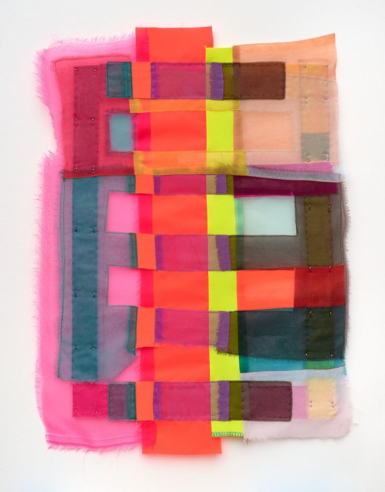 I am inspired by the colors and textures of transparent and opaque fabrics I collect and sew into layered, geometric collages. The construction of each piece is a journey. Through my stitching methods and varying degrees of fussiness, I explore and challenge expectations of perfection, the rigidity of traditional rules, and what has historically denoted success for women. Everyone has a relationship with fabric, so the colors, textures and types of fabric used in the work stir up personal memories of childhood, special events, personalities, lifestyles, ethics, privilege and wealth. My fabrics range in cost and quality from thrift store finds and bargain bin remnants to high end silks. The stitching is done both by machine and by hand, sometimes neat, sometimes unpredictable and haphazard. The fabrics are often frayed, ripped apart and reassembled, leaving holes that expose a trail of my process.