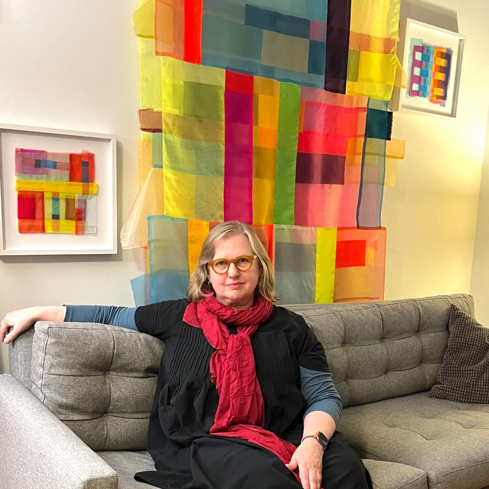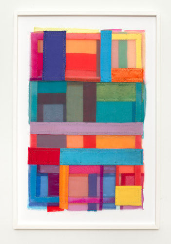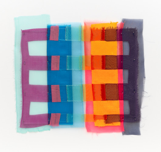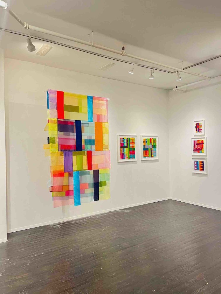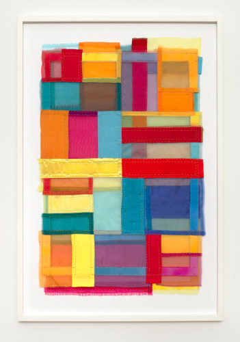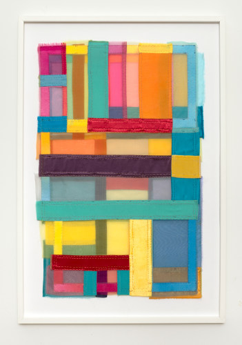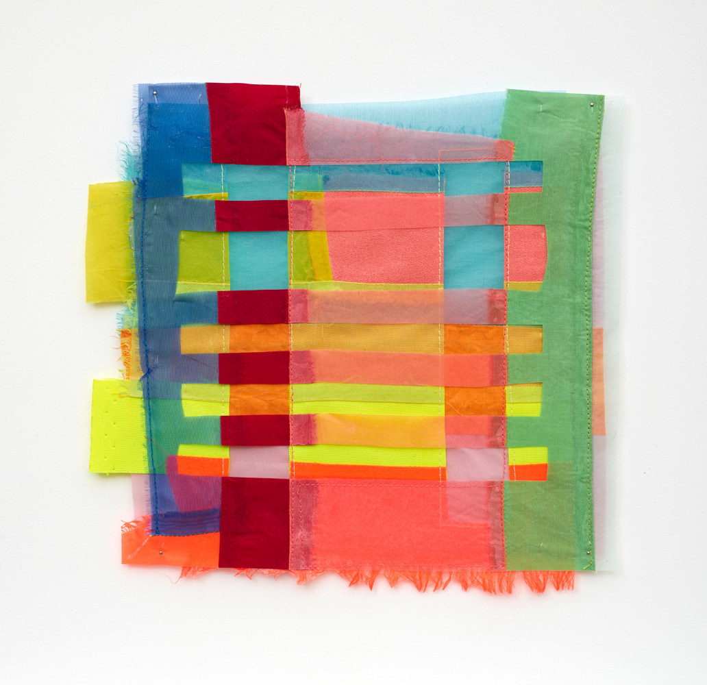 There is an architectural element to my work; I build each piece forward from my past. The bright colors are constructive and positive. The transparent and opaque layers overlap, causing the colors to glow from underneath. The two-sided hanging work invites the viewer to look for the places where they can see into the distance. Opaque fabrics create a visual block but the color and texture changes if something transparent is layered on top.