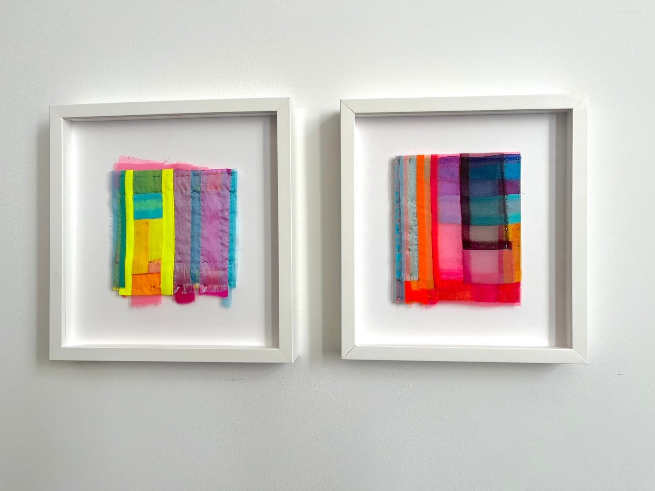 Linda Kamille Schmidt's abstract fiber art pieces are primarily framed, but occasionally, she crafts flowing, hanging works. All her pieces exude a playful spirit, characterized by vibrant and weightless colors that interweave and interact, giving rise to optical illusions within their layers. The intersections between the geometric fabric layers resemble the blending of pigments, evoking a painterly sense of movement and effortless fluidity.