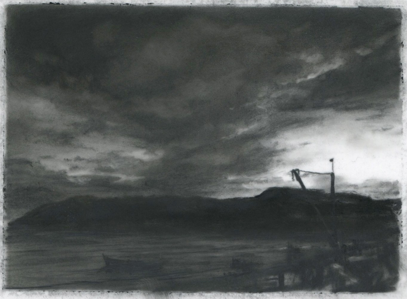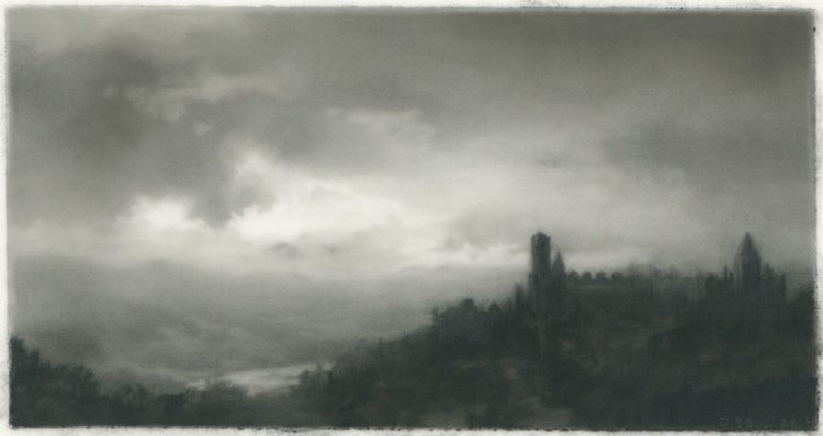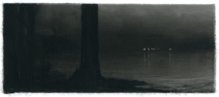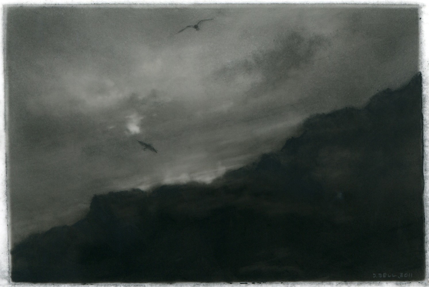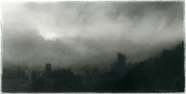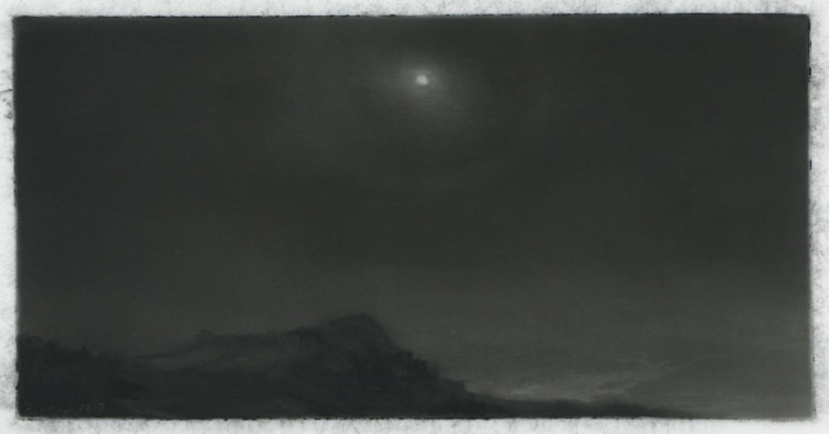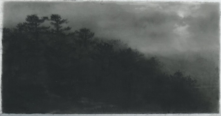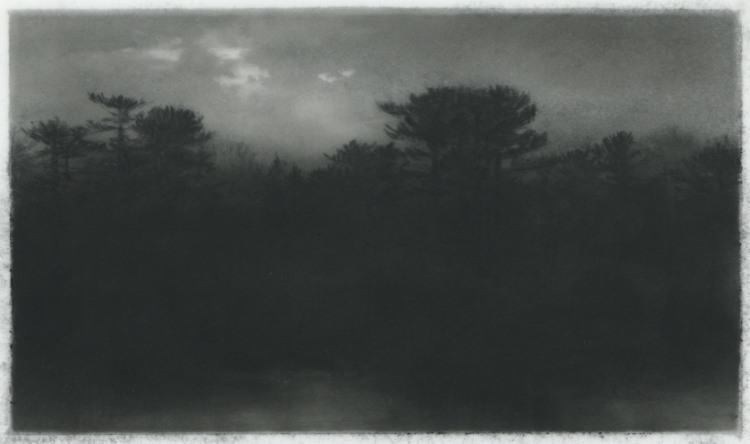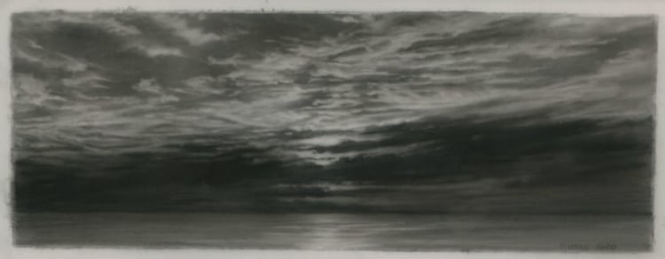 Dozier Bell’s paintings and intimate, diminutive charcoal drawings (some of which measure as small as 2 x 4 inches) bring to mind 19th-century American painters Albert Pinkham Ryder, R. A. Blakelock, Frederick Church, as well as England’s John Constable. Exacting and deliberate, often mysterious impressions of nature's disquieting, transitory presence, her works comprise a vision of nature that sweeps across vast plains and valleys, ascends into lofty skies, and reaches toward far distant horizons,… The vision often pictures nature at dawn or dusk, its light generally dimmed and pale or momentarily darkened by clouds, its expanse sometimes broken only by a first or last glimpse of the flashing sun, its temper otherwise solemn, even troubled, as if brooding.