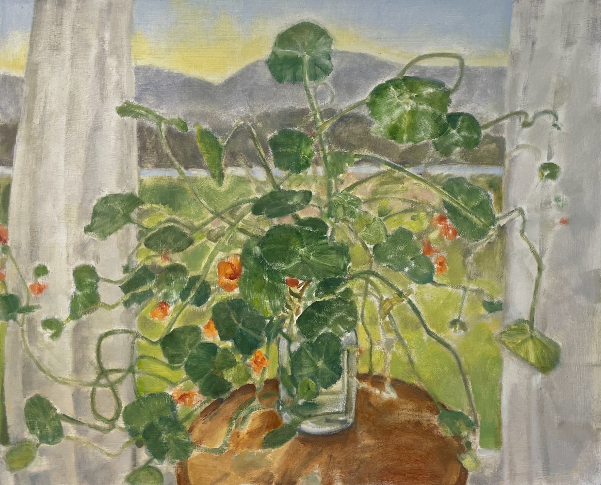 Many of these floral arrangements gracefully share the stage with distant landscapes, inviting viewers to contemplate both inner and outer worlds. The scenes themselves offer an immediate sensory experience, encompassing atmospheric conditions and the play of natural light. Though the feathery quality of Craddock’s brushstrokes recalls her plein air paintings, these works transcend mere representation and evoke a temporal distance. The pastoral scenes are reminiscent of the artist’s long history of landscape painting, reaching even further back to a time when she was working in her New York City loft of over 40 years. In the foreground, Craddock’s blossoms are transformed into memento mori, talismen of the ephemerality of life. The linear, geometric windows, placemats, and picture frames of the middle ground stand in formal contrast to the organic shapes within the compositions. Craddock’s windows introduce abstract elements to her paintings and intensify the distance between the viewer and the artist’s past.