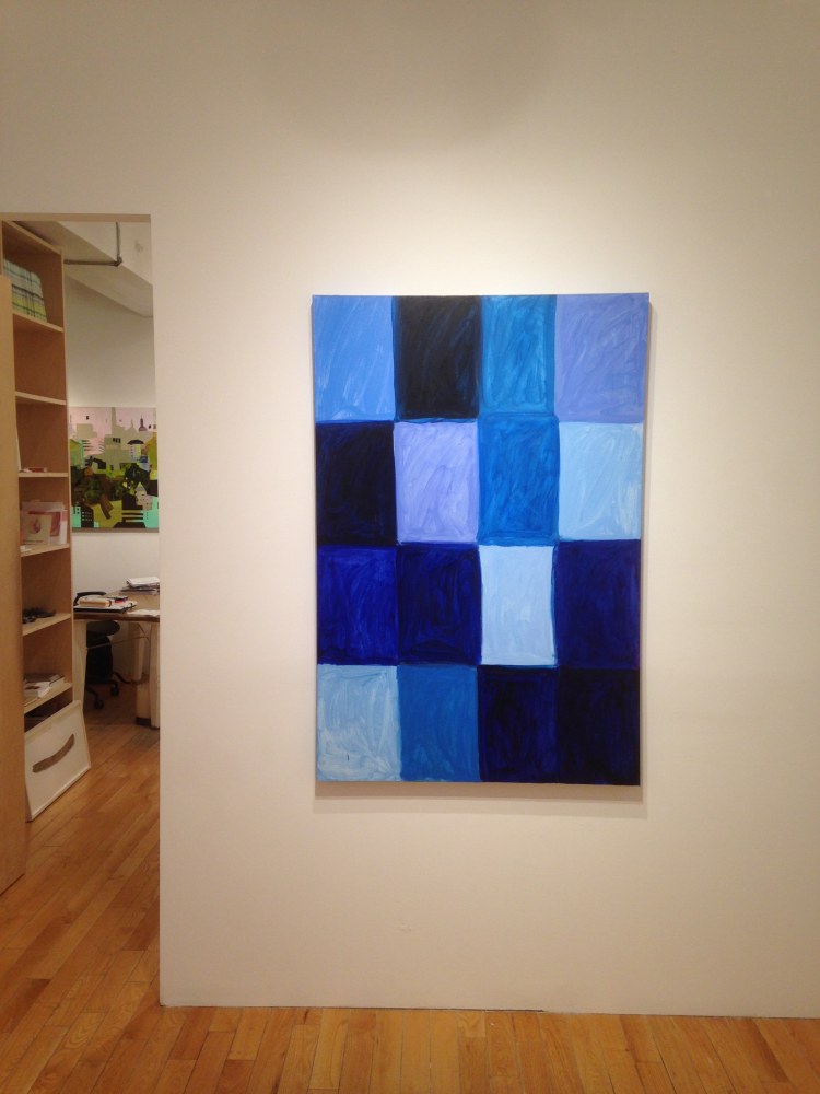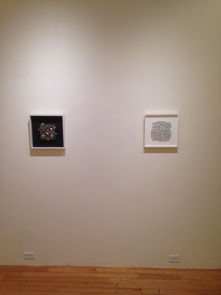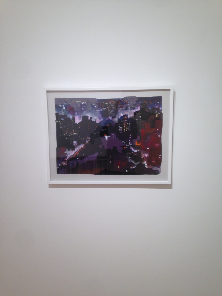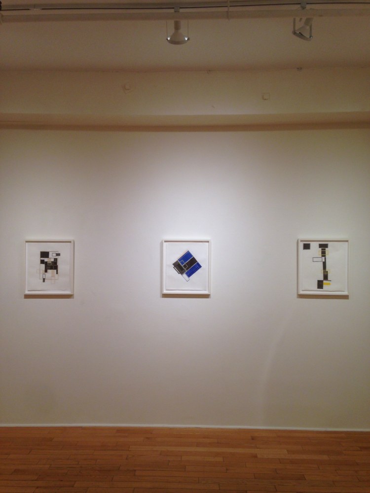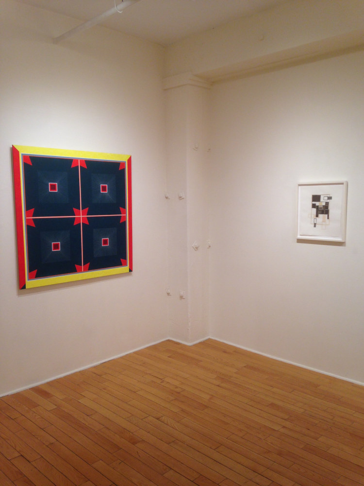 Mary Heilmann’s Bab Boujeloud, 1996, inspired by the arched Islamic gate in Fez, Morocco, captures the changing colors of juxtaposed mosaic tiles as they reflect the sunlight. Tamiko Kawata explores Pueblo architecture, traditionally flat roofed structures, stacked and situated around an open communal space, in both two- and three-dimensional form in Pueblo Drawing, 2014, and Small Pueblo #2, 2015, the latter composed entirely from safety pins. Mary Judge’s time spent painting for the design market at the Grazia factory in Italy is evident in her symmetrical painting, Diadema Red and Green, 2014, which also faintly resembles an architectural floor plan. Shona Macdonald illustrates how the manmade interrupts the natural landscape with her silverpoint series Ground Coverings, and Sandy Litchfield creates dreamy amalgams of the urban and natural landscapes with her collages Purple Haze and Study for Metropolush, both 2011, illustrating how the constructed environment seeps into our unconscious.