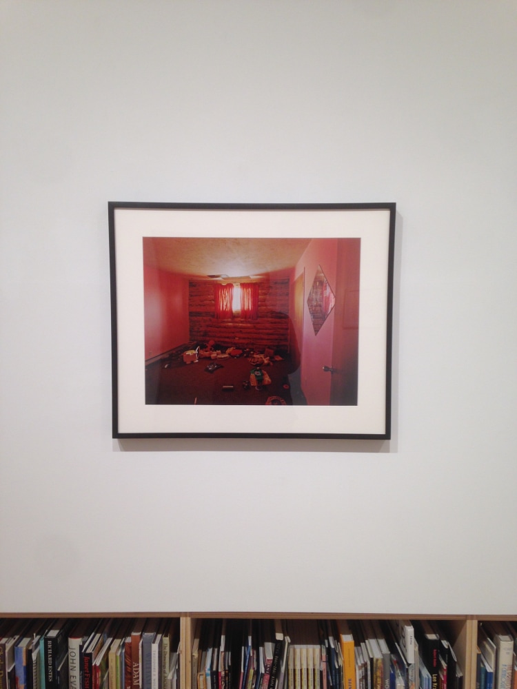 The commanding photograph Loos, 2013, by Linda Lindroth, towers over viewers like a modernist building. In it, an enlarged, collapsed box takes the shape of a high rise. Its horizontal black and tan lines are a nod to architect Adolf Loos’s unrealized design for Josephine Baker’s residence. Loos’s buildings, such as The Looshaus (1911), in Vienna, illustrate his distaste for ornament, which he blamed for societal ills and decried as wasteful. Today, amongst conscious efforts to curb wastefulness, “repurposed” and “reclaimed” have become designer badges of honor. Leslie Kerby explores repurposing with her Containment Series, collages that question how shipping containers, traditionally used for safely delivering cargo, affect human consciousness as they evolve into permanent and temporary low cost housing. Timothy Hursley approaches repurposing from a different perspective with his pink-hued photograph Kid’s Room, Carlin Social Club, Carlin, Nevada, 1988/1990. What was once a brothel, is now a private residence, and the children’s room, strewn with toys, bares evidence of its former life with a partially mirrored ceiling and bordello-red curtains.