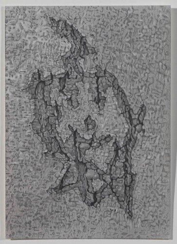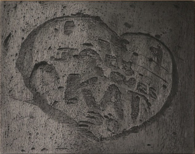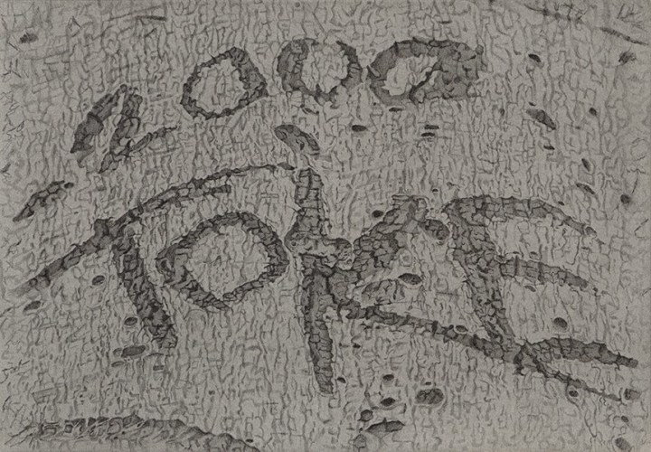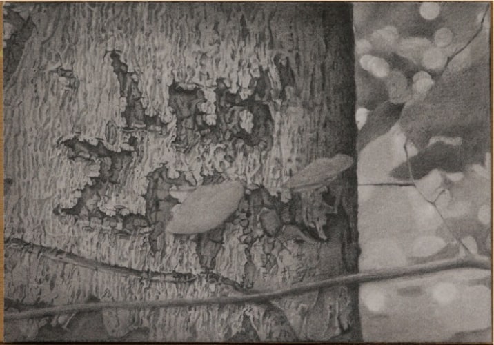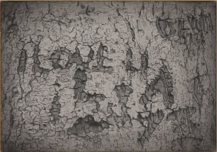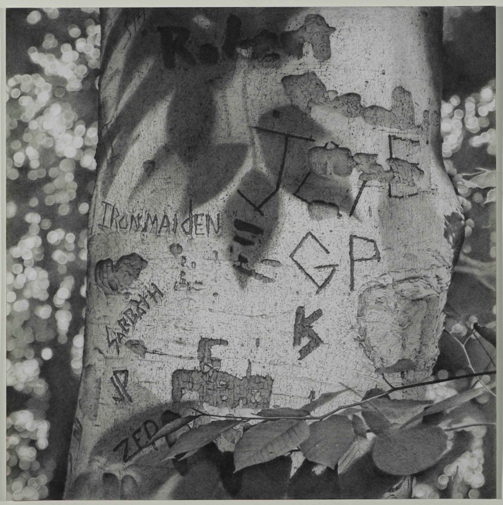 Working in both powdered graphite and lead graphite on paper, the artist memorializes tree carvings or “graffiti” found within the woods of Alley Pond Park, Queens. The imagery in these new drawings continues the dialogue Reilly pursues with urban life and nature via the discovery of oft-forgotten, secluded spaces in the parks and other outlying sites within New York City. Time spent in the “ancient growth forests” of New York – specifically Alley Pond Park, sparked this new body of work.