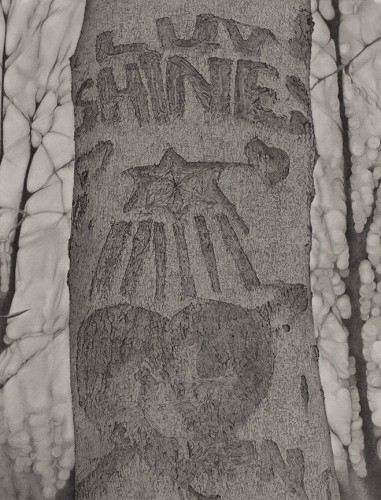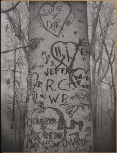 Reilly elevates the gnarled bark and scarred trees into something silvery and timeless. Each carving is different and speaks to its own unique history. Reilly describes walking through the woods as if it were a trip back in time. Each carving creates a narrative in her mind of the people that left them. Some are romantic in nature and most likely left by lovers, while others seem left by people hanging out in groups. Reilly selected her favorite imagery from each category to create homage to these anonymous small crimes of passion, which nature seems to have endured without pause.