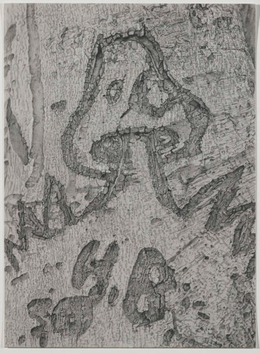 Almost every [carving] made me imagine the people from the surrounding neighborhoods walking into the park, whether it be kids drinking, smoking and hanging out, or lovers taking a stroll. I found the faceless initials carved on the trees and what might be the story behind them to be most interesting. – Mary Reilly 2014
