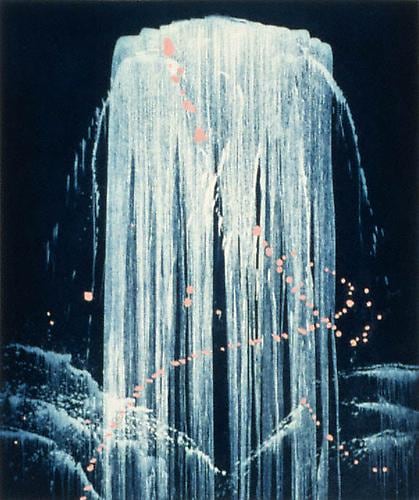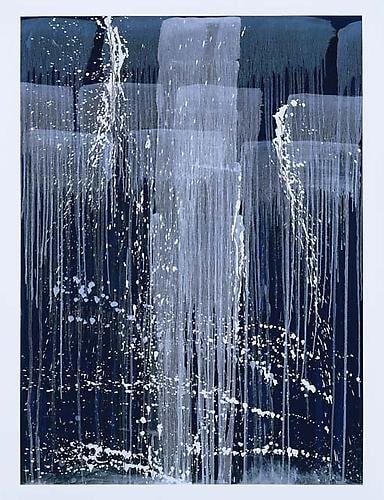 Pat Steir was born on 1940 and studied graphic art at Pratt Institute, Brooklyn, New York. Known for her delicately balanced  interplay between the force of gravity and the properties of paint, her skilled fluctuation between deliberate control and chance occurrence, Steir’s compositions possess a radiant and mystical beauty.  Her work is inspired by the colors of the Renaissance, the tenets of Abstract Expressionism, and Chinese landscape paintings from the Tang & Song Dynasty.   She makes her marks by flinging, pouring, and dripping paint. Images of waterfalls resulted naturally from this approach, and she has also worked from time to time with images that evoke the night sky.