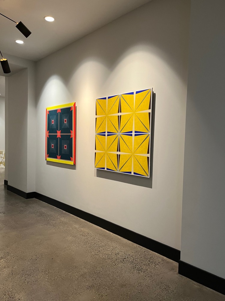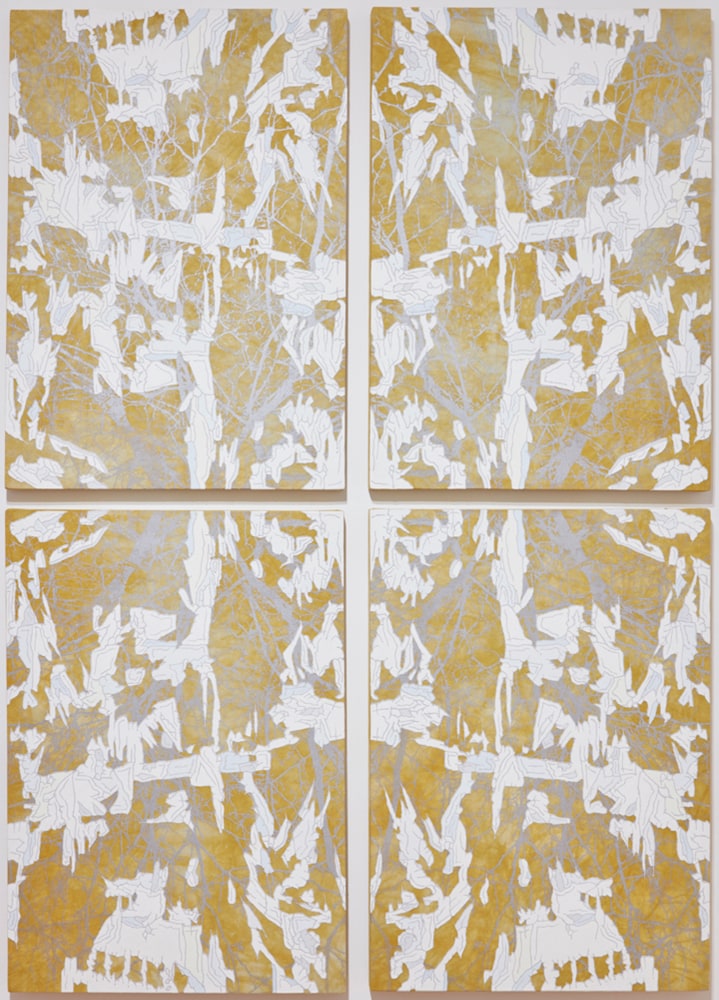 J Ivcevich blends innovative drafting technologies with traditional artisanal craft to create his abstract paintings. Drawing from images of tattered street advertisements, Ivcevich begins by manipulating the canvas surface with tie-dye and silk-screen techniques. Imagery taken from the found advertisements is then put through a process of layering and compositional reduction, then flipped, mirrored, and tessellated into a bursting mandala of forms. J Ivcevich received his Bachelor of Arts from Emory University in 1994. He was the recipient of the Pollock-Krasner Grant in 2001 and was featured on the cover of New American Paintings in both the Southeast and Northeast editions. Ivcevich has had solo exhibitions in New York, Indianapolis, Washington D.C., Chicago, Atlanta, and Memphis. A painting from this series is part of the Art in Embassies collection in Laos.