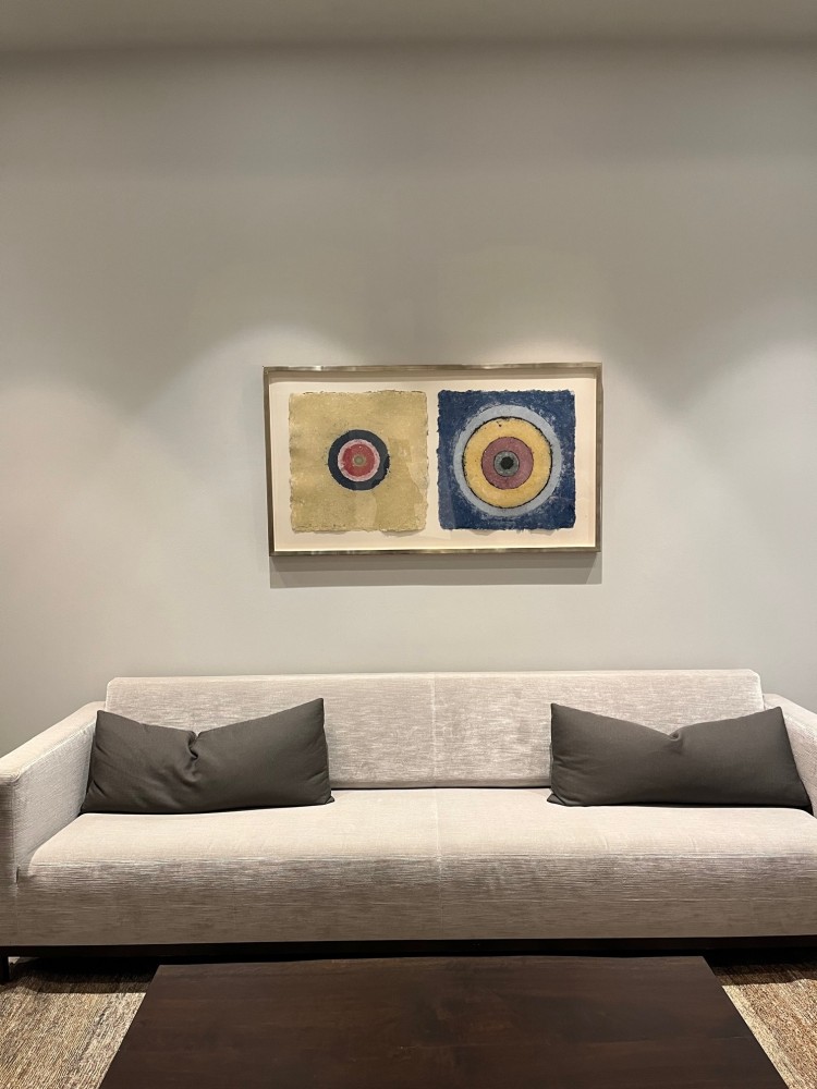 The monotype in this show, Ground Zero V, is one of Michael David's "target" works from the early 1990's. Created with Pace Editions, the artist achieves a unique marriage of pigment and ground as the paint is literally fused into the tactile handmade paper. The textural quality of this work is reminiscent of the artist’s paintings in encaustic. Different levels of meaning can be interpreted from the concentric circles of this poetic composition: the solar system, cells, bullseyes. The work also relates to David's continual examination of the Doppelganger. The asymmetrical pair of radials stares out, hypnotic in their attraction. Michael David, a Guggenheim Fellow artist, has been exhibiting his paintings internationally since 1981, first with Sidney Janis Gallery and then with M. Knoedler & Co. for over two decades. His work is included in the permanent collections of the Metropolitan Museum of Art, the Guggenheim Museum, and The Brooklyn Museum in New York; The Houston Museum of Contemporary Art, and the Denver Museum of Contemporary Art to name a few. He was the subject of a one -person exhibition at Aspen Museum of Art.