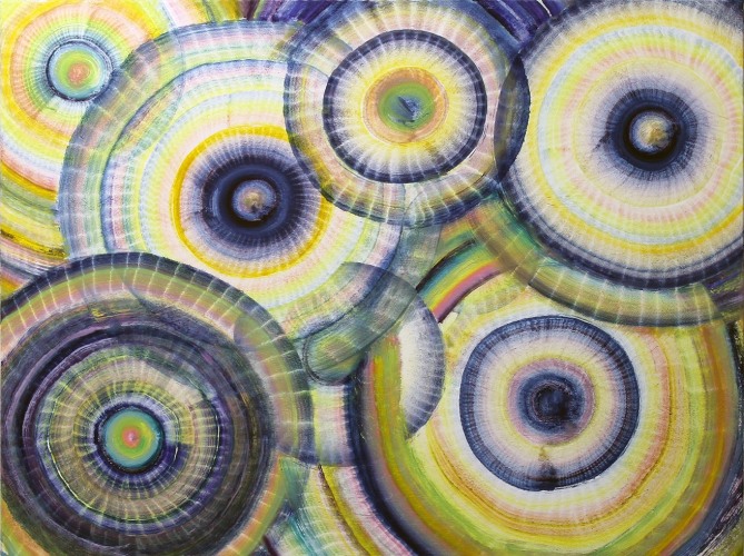 Danielle Riede’s glimmering striations of color overlap and mingle, like ripples spilling out from stones dropped in water. The semi-transparency of her pigment gives her painting a sense of depth and volume. Her ripples not only push out from the center, but also build atop one another. Inspired by dance and the ephemerality of nature’s motion, Danielle Riede uses paint to transfer movement’s invisible pathways onto canvas. She received her Master of Fine Arts in Painting from Virginia Commonwealth University and also studied with Daniel Buren at the Kunstakademie Duesseldorf. Her international exhibition record includes galleries and museums in Mexico City, Athens, Berlin, and New York, to name a few. Danielle Riede is the recipient of numerous awards including the Virginia Museum of Fine Arts Fellowship, the Virginia Commission for the Arts Fellowship in Sculpture, a New Frontiers Grant from Indiana University, and the 2021 IAHI grant from Indiana University. She is currently the Randolph H. Deer Professor of Painting at Herron School of Art and Design, Indianapolis.