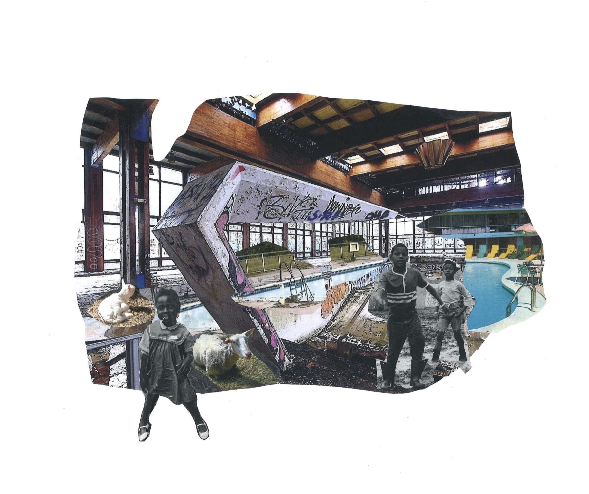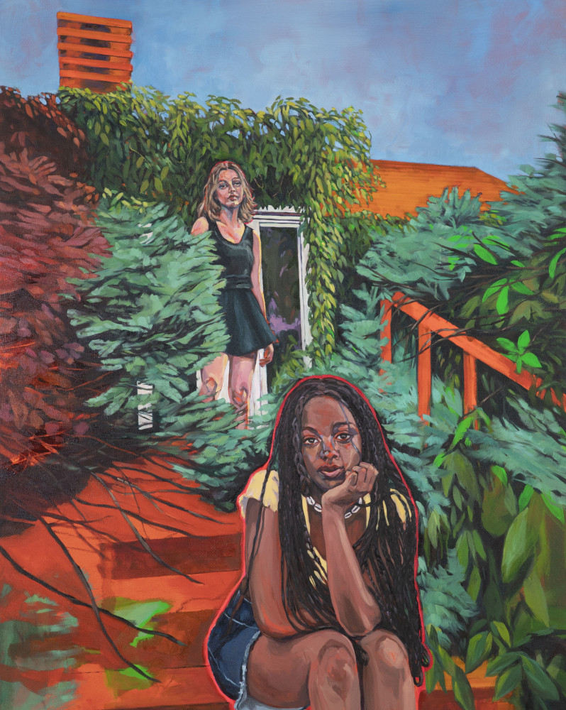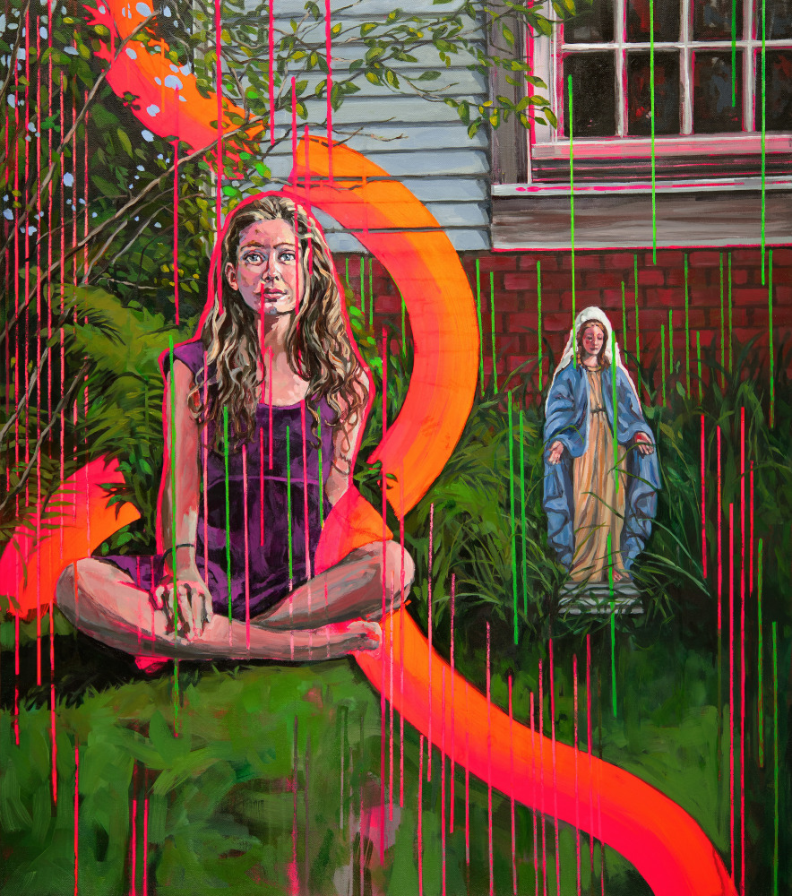 Shapiro’s settings for her visual narratives range from rough and dilapidated to pristine upper-middle-class suburbia. These spaces act as air-tight dioramas in which Shapiro experiments with and conflates indicators of time. Homes collapse, foliage grows wildly, pools fill with murky, green water, and colorless vintage images collide with vibrant modern ones. Shapiro's perplexing convergences serve as a reminder that current ideation cannot exist without the passage of time or the intrusion of memory. No moment exists in temporal isolation. She further destabilizes the viewer with drips, sprays, and streaks of hot, electric color. Despite the chaos around them, Shapiro’s young women appear unaffected. Whether they are blithely unaware or reveling in their own power is left to the viewer to determine.