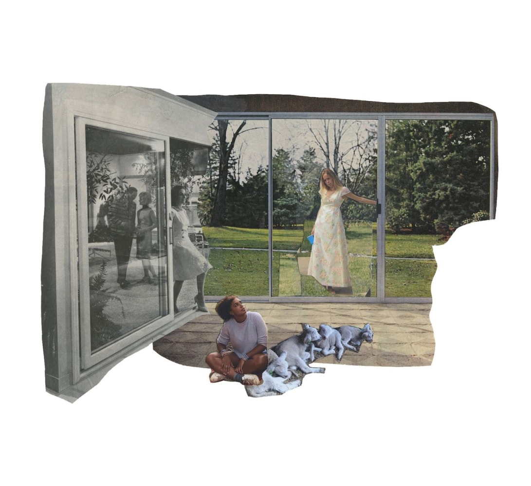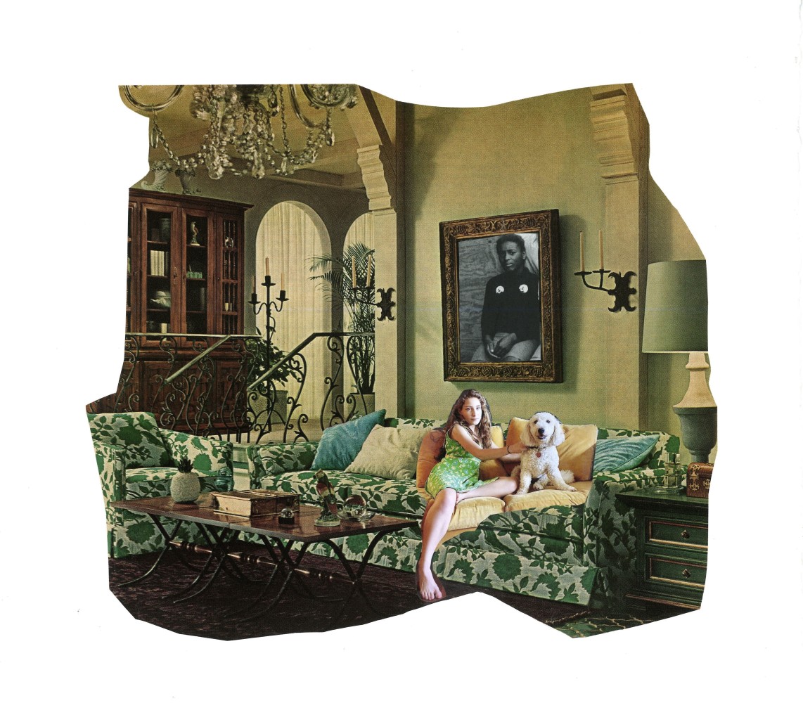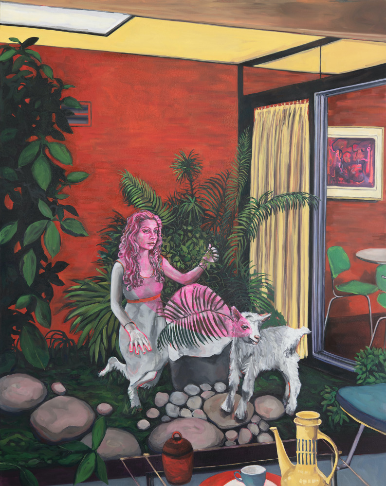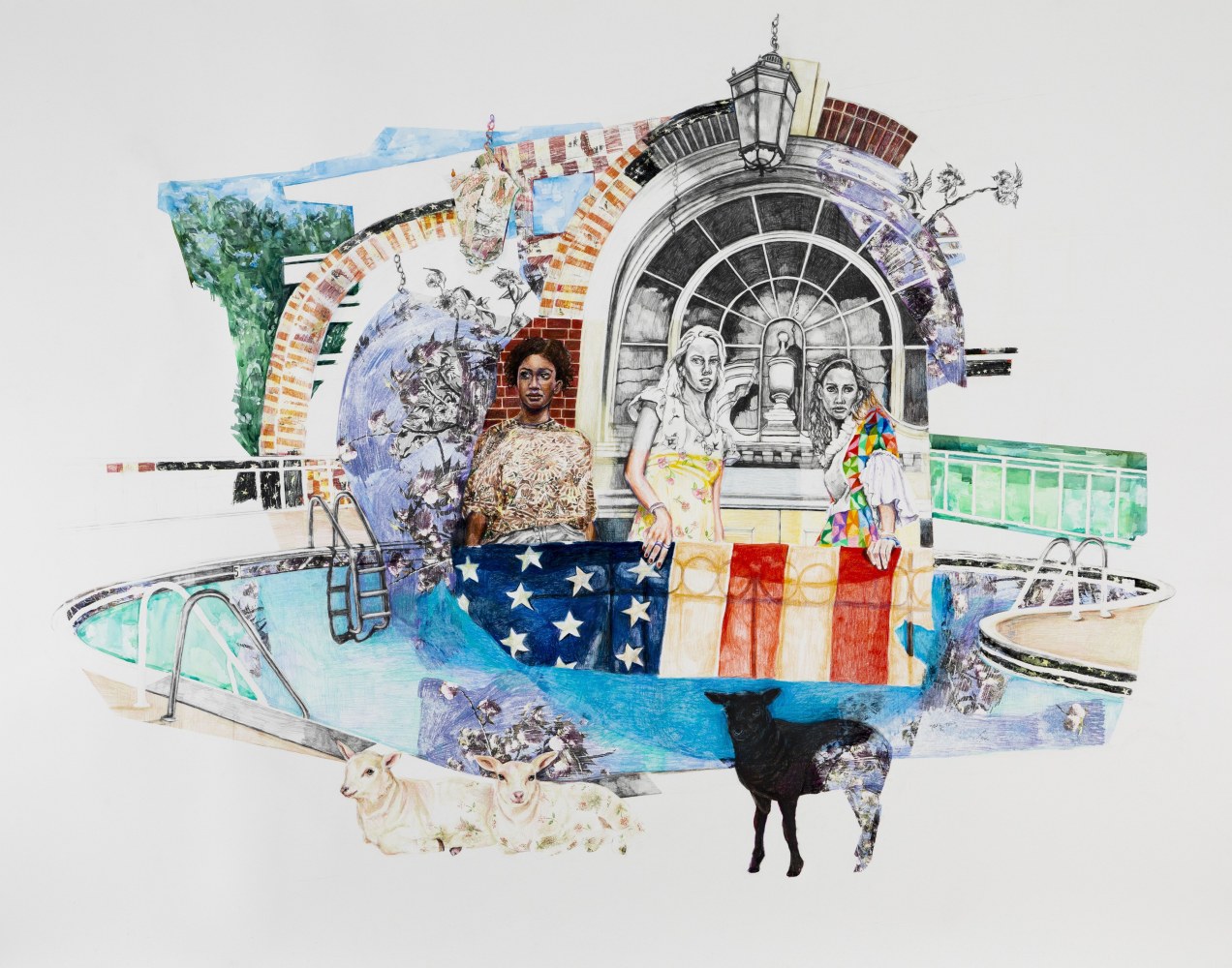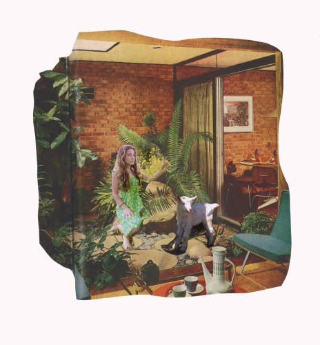 Sharon Shapiro layers elements from traditional American value sets, the artistic canon of the female nude, and surrealism to create her visual narratives. Her depictions of young women capture a transitional space in their development; they wield a power they do not yet know the extent of. Images of sheep – icons of innocence – are interjected amongst the young women, further intensifying the juxtaposition between naivety and experience. Both Shapiro’s painted and collaged women are shown in relaxed, almost languid postures, reminiscent of 18th and 19th-century nude painting. Unlike their predecessors, Shapiro’s women are not filtered through the male gaze and are permitted nuance and complexity. They find ease in unpredictable and brashly-toned dystopic environments and assert themselves within idyllic suburban scenes. Shapiro’s depictions of women in pairs further challenge traditional modes of isolation and objectification. Their sense of independence and vulnerability is bolstered by camaraderie.
