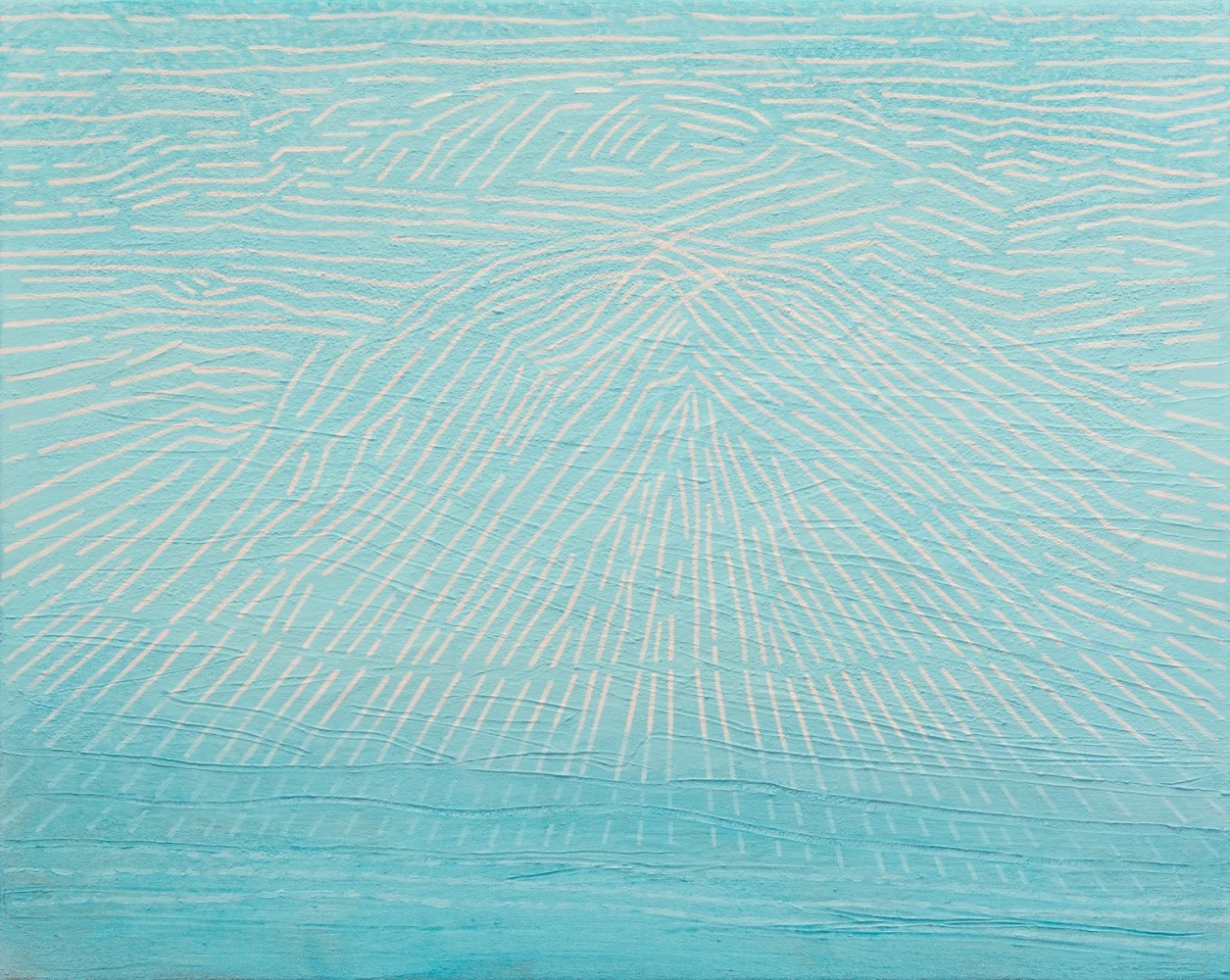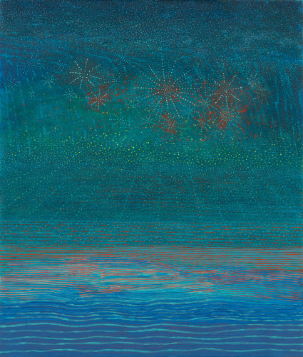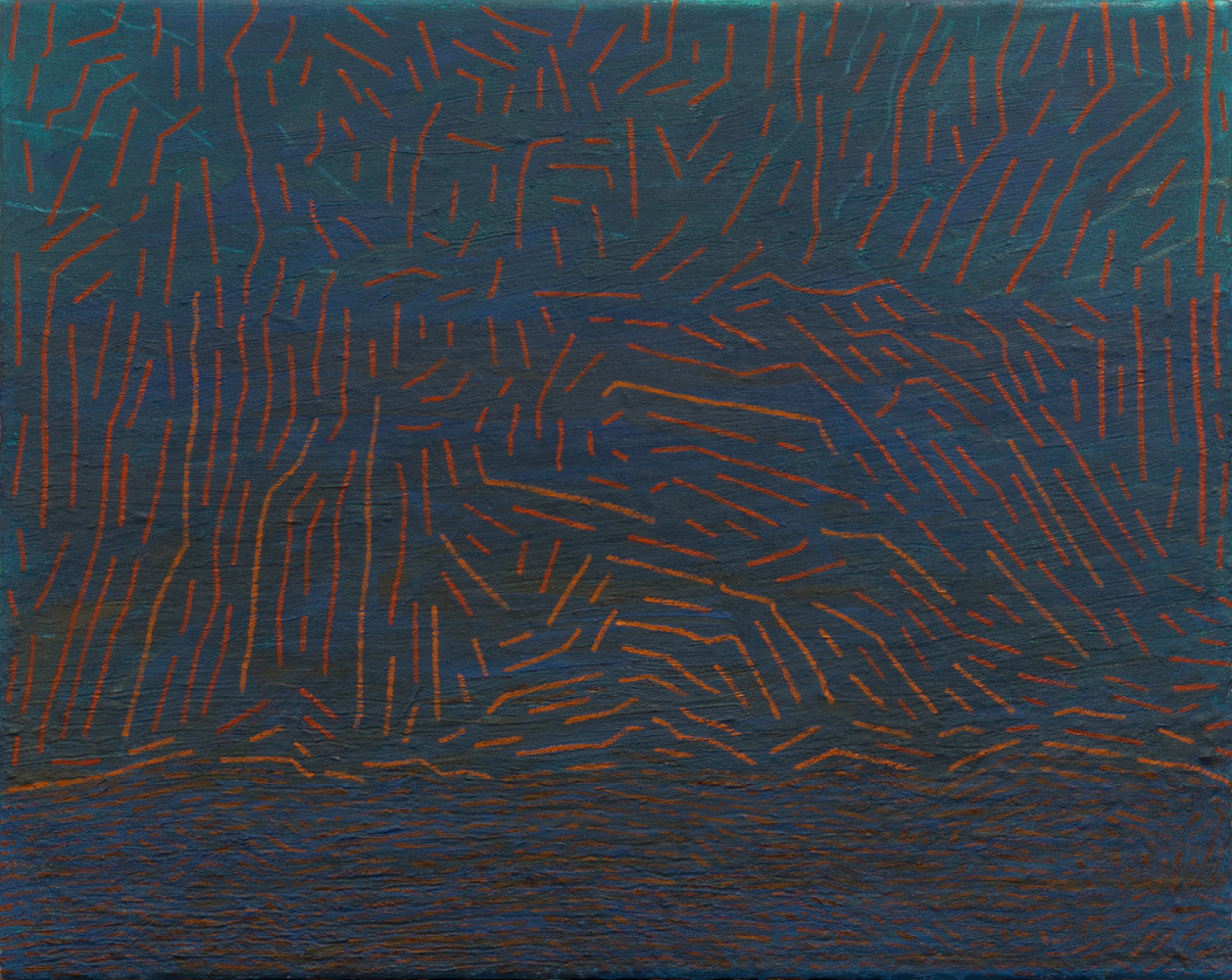 Applying acrylic paint both thinly and thickly, I often add elements like mica, metallic pigments, and glass beads for various effects. There is a push and pull between improvisation and control in my process. I want possibilities for the painting to remain open so the work evolves slowly over time with multiple changes and layers. The layered histories hold a record of my memories and feelings of places and experiences, as well as my present state of mind, and the ideas I am thinking about. I am searching for something that surprises me, holds some kind of mystery, or inspires curiosity, or wonder.