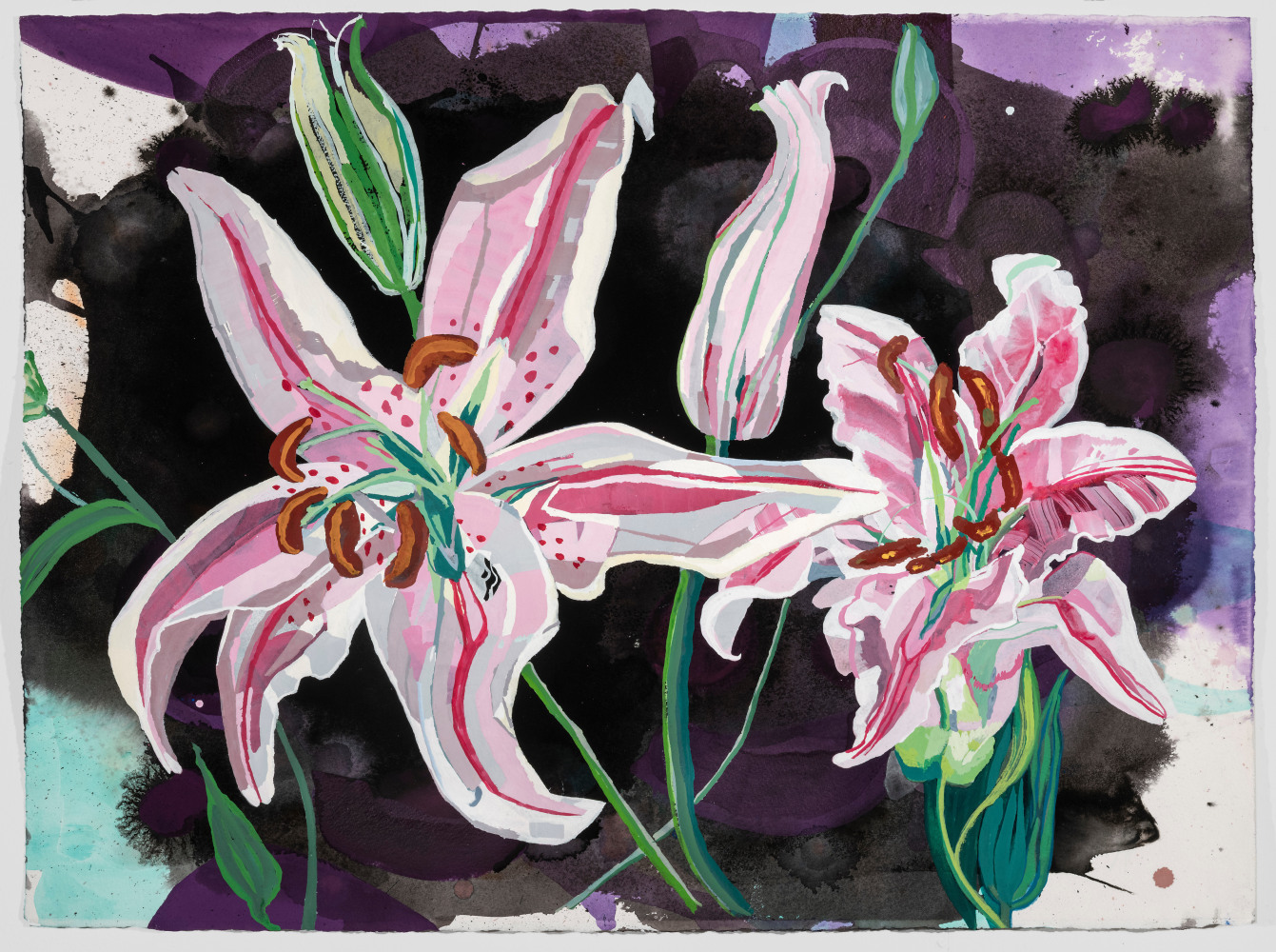 Elisabeth Condon (American, b. 1959) is celebrated for her lush, layered paintings that merge abstraction, landscape, and decorative pattern into vibrant, immersive worlds. Influenced by Chinese scroll painting, Abstract Expressionism, and the ornamented interiors of her childhood, she begins her compositions by pouring paint, allowing chance and gesture to guide the work. Onto this fluid foundation, she weaves intricate patterns, botanical forms, and geometric motifs. Through her work, Condon reclaims decorative pattern and domestic ornament as powerful strategies within abstraction, elevating motifs often dismissed as feminine or secondary. Condon has forged a distinctive voice in today’s art world. Her paintings dissolve the boundaries between natural and artificial, chaos and order, offering a vision of landscape that is both rooted in tradition and vividly contemporary.