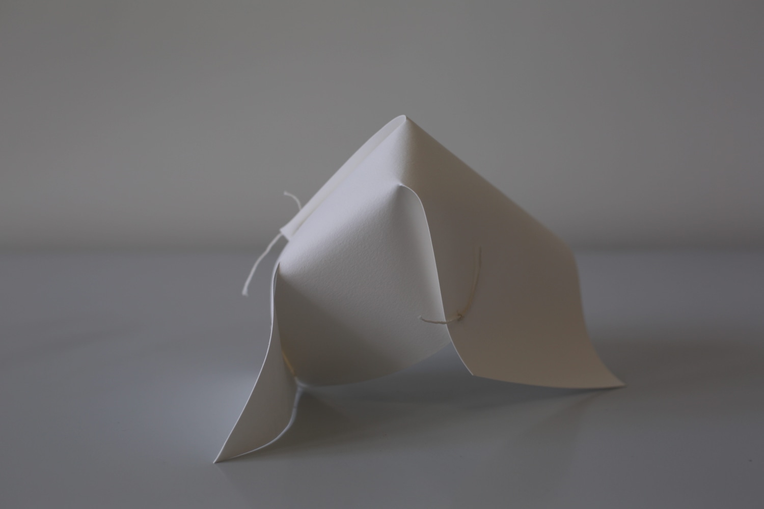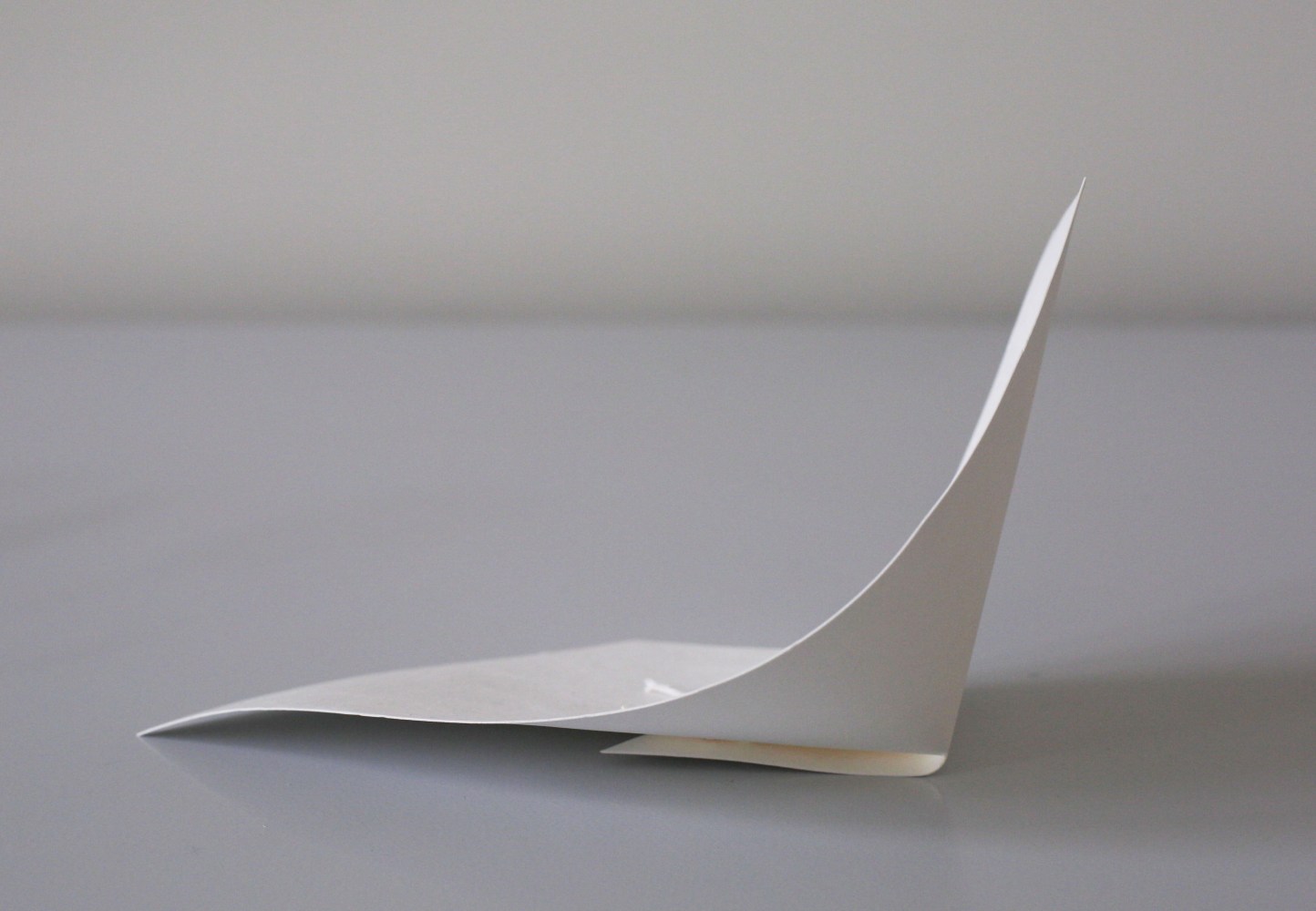 In this current series “Fictional Reality: The Photograph and Its Object,” I move back and forth between paper objects and the photographs I make of them. The accompanying images are divided into two parts; the first set is straightforward documentation of the sculptures on a neutral background and the second are the digital images of the same set of objects, which I present as pictures rather than as documentation of sculpture. Between them, the power of work in each medium to evoke a fictional world—to be something other than what is literally present—rises to a new kind of visibility. An example of the aluminum shelf each of the paper sculptures sits on is represented in the first image.