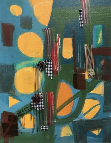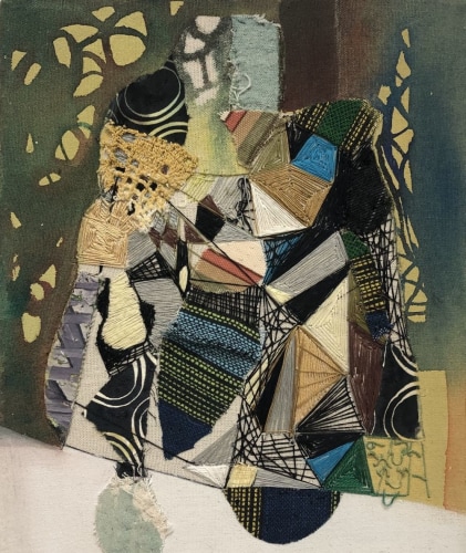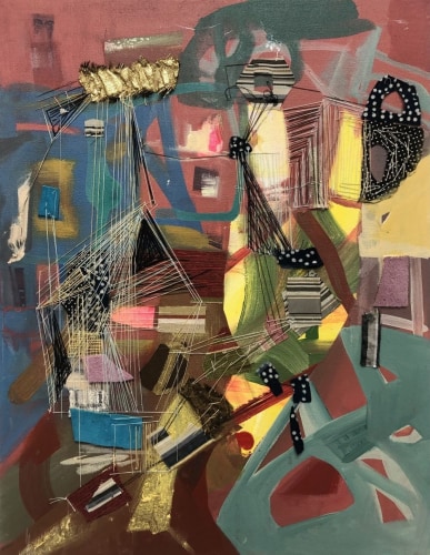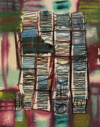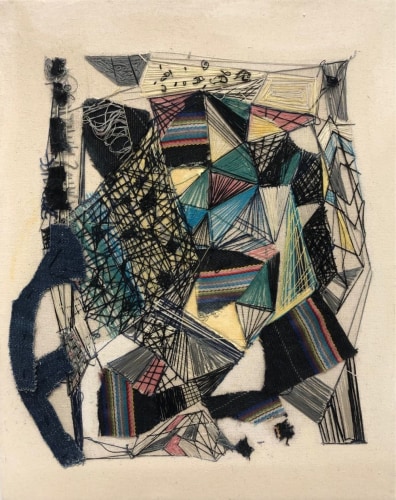 In her string paintings, Agopian weaves together fragments of canvas, fabric, thread, and paint to create textured, dimensional surfaces. These hybrid works defy fixed spatial logic, suggesting both movement and instability while evoking the layered nature of her personal and cultural experience. Her process is improvisational—part painting, part weaving, part personal archaeology—building and unbuilding layers and narratives in flux. As she has said of her own work, "I know it’s finished when I feel that it exists somewhere in the Universe."