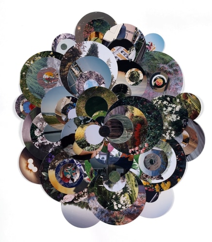 Heather Cox works across sculpture, installation, collage, and photography to explore memory, loss, and the afterlife of images. She trained in book arts and photography at Mills College, studied sculpture at the Skowhegan School of Painting & Sculpture, and earned her MFA from the School of the Museum of Fine Arts, Boston. Her work is shaped by her interest in the ways photographs fade, distort, and degrade over time—and how these fragments can take on new life. In her ongoing Roundels series, discarded pictures are cut, stapled, and arranged into net-like compositions that feel both delicate and resilient. Cox’s perspective is informed by her role as Executive Coordinator at the Whitney Museum’s Conservation Department, where she collaborates with artists and conservators on questions of care and preservation.