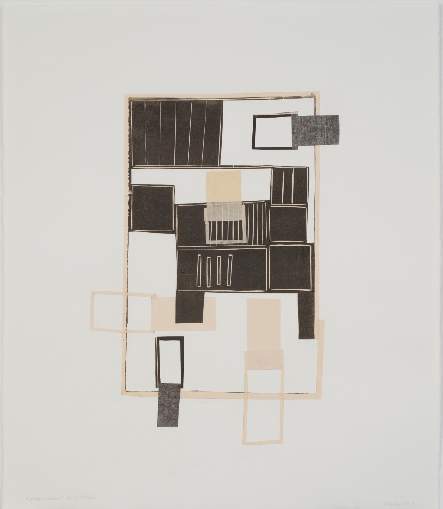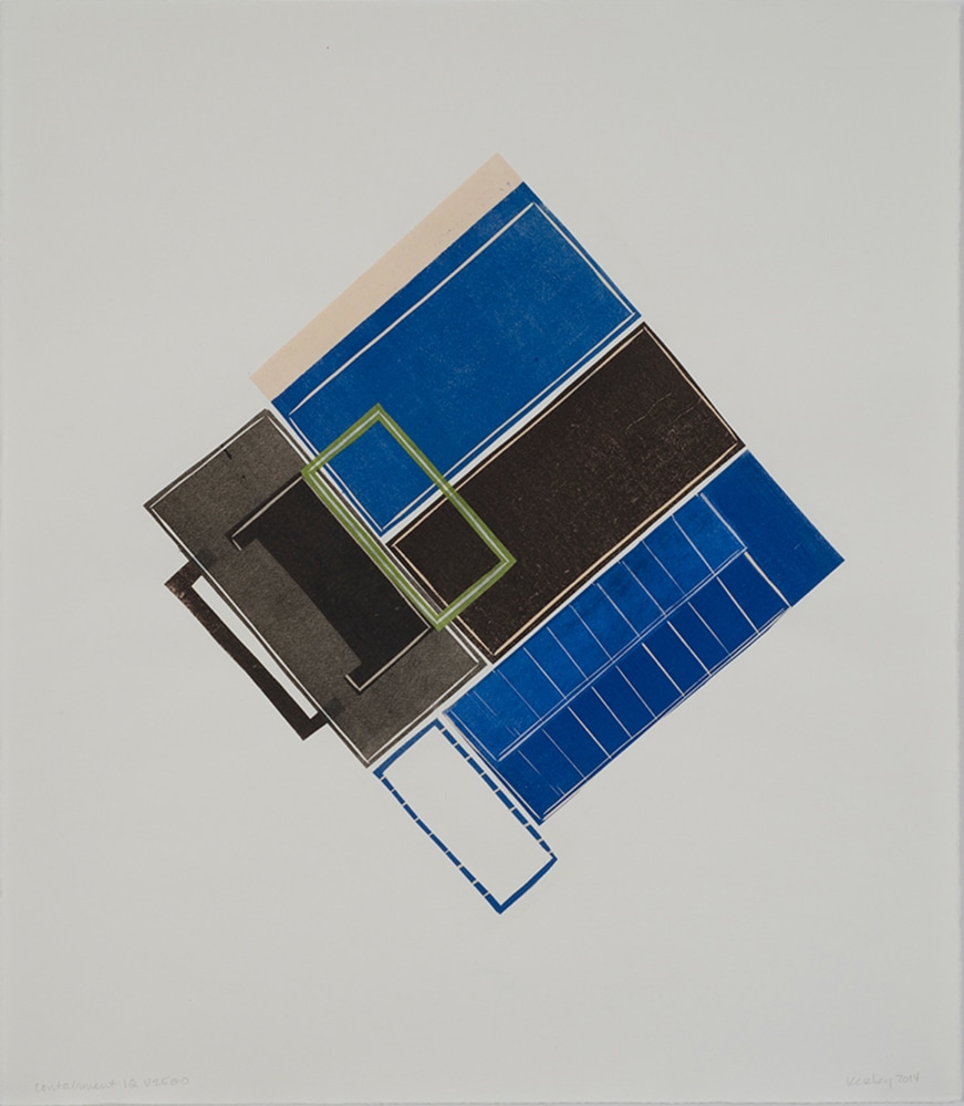 Leslie Kerby focuses on social narratives exploring the constructs of identity, communal spaces and social media. Her Containment Series collages explore the use of shipping containers for permanent or temporary housing, and as vessels for risky passages to freedom. The containers, typically sealed and used for the safe keeping of their cargo, have become a burgeoning communal space. The titles are derived from the international numbering system used to identify the type of container and country of origin.