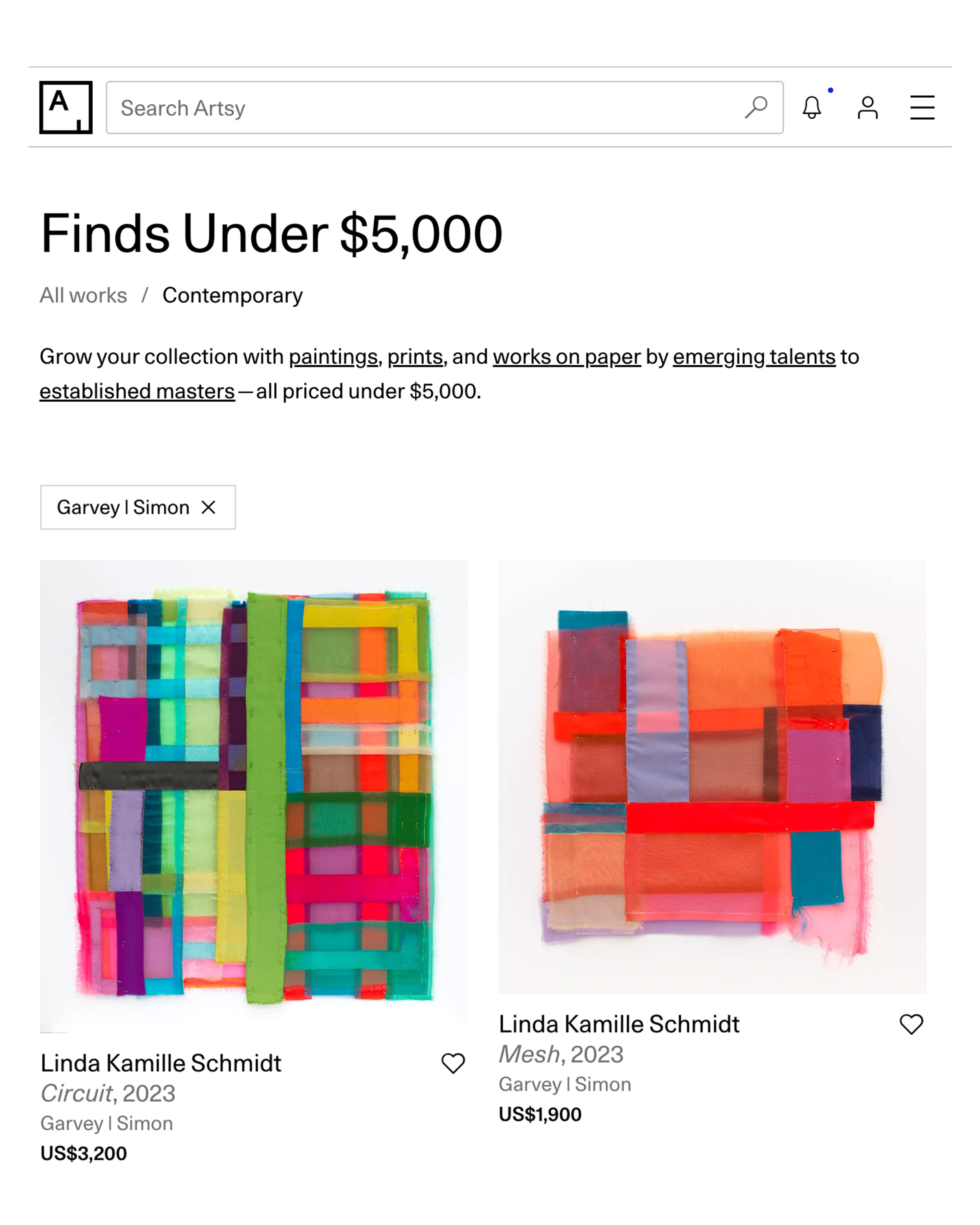 Linda Kamille Schmidt's abstract fiber art pieces are primarily framed, but occasionally, she crafts flowing, hanging works. All her pieces exude a playful spirit, characterized by vibrant and weightless colors that interweave and interact, giving rise to optical illusions within their layers. The intersections between the geometric fabric layers resemble the blending of pigments, evoking a painterly sense of movement and effortless fluidity.