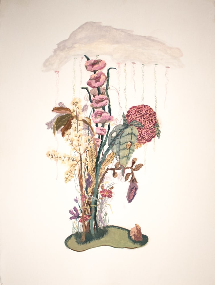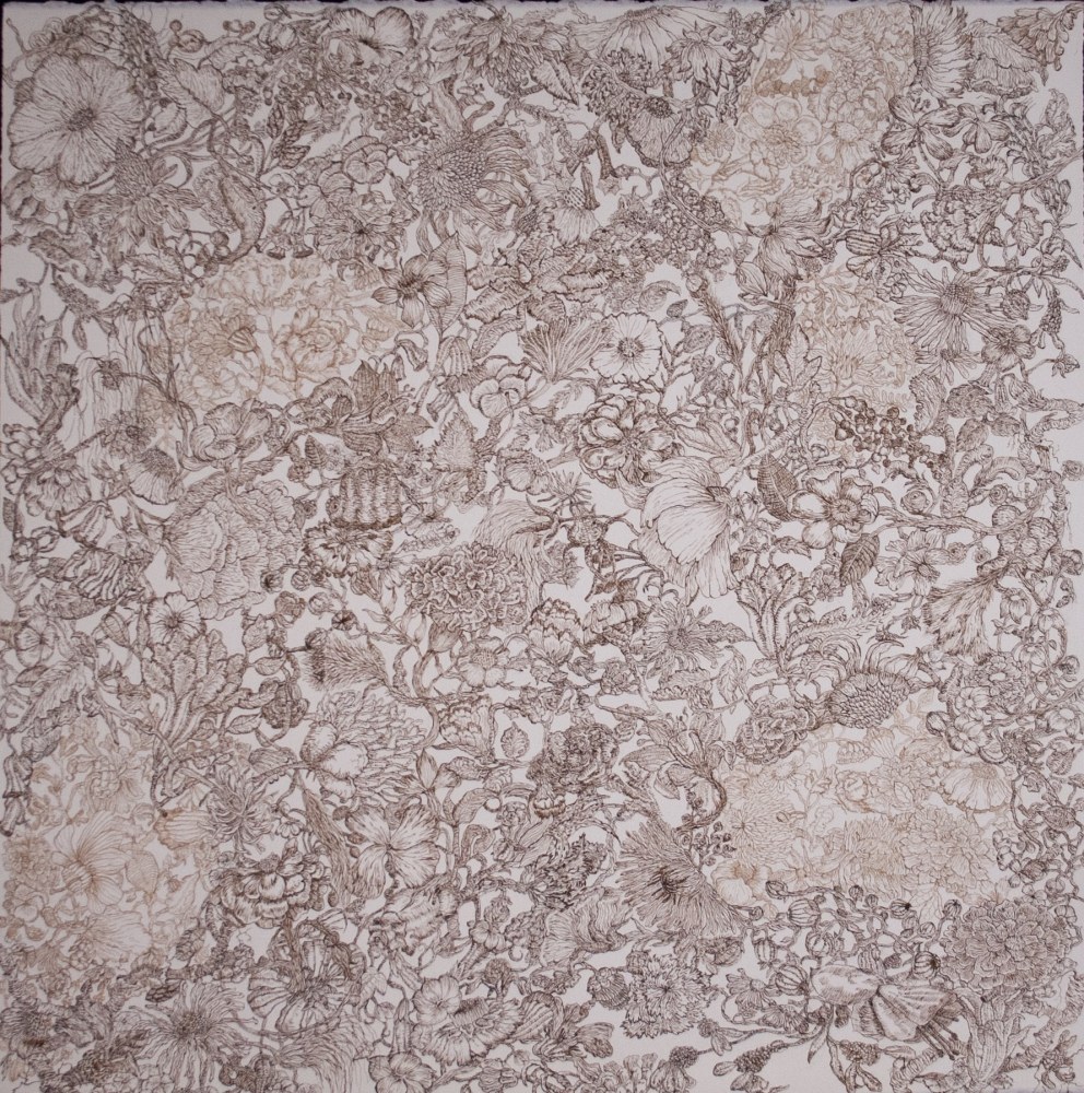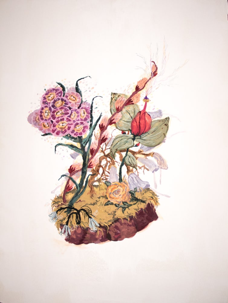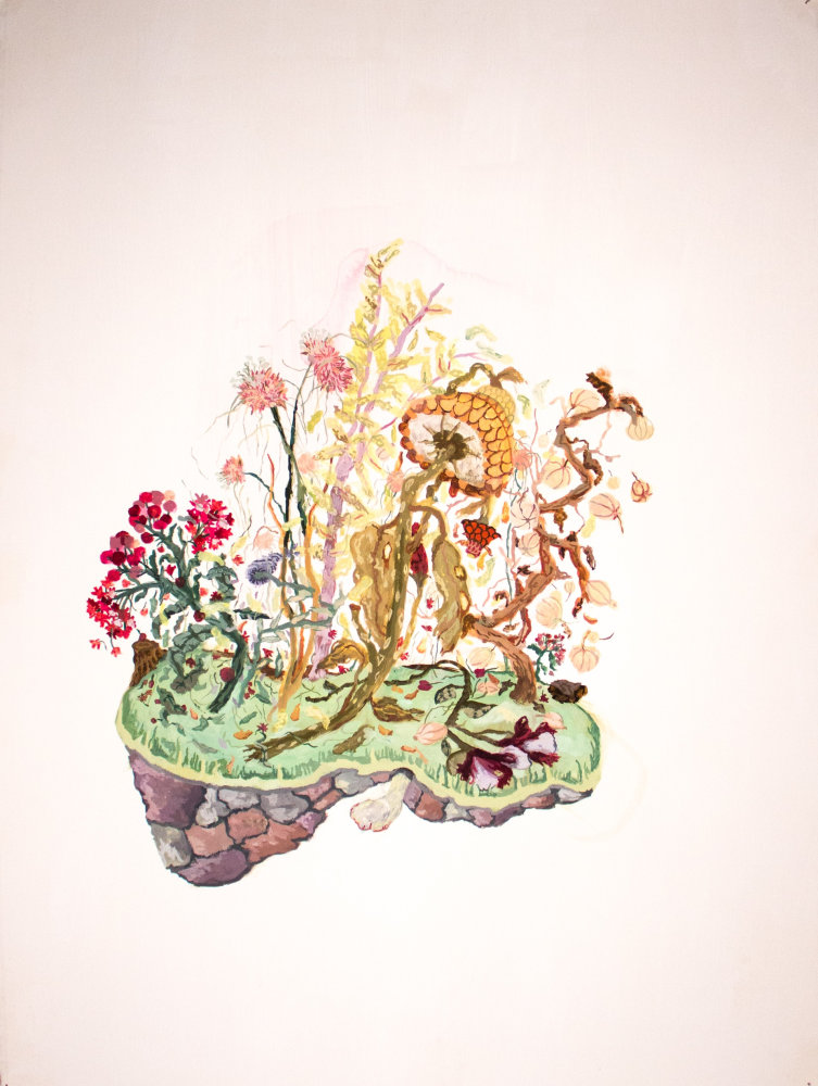 Two overriding themes in my studio work have been a commitment to narrative and an infatuation with outdoor settings. These recent paintings do not vary from this but more fully investigate the latter, focusing on land and foliage. The romance of landscape as evidenced in the work of French rococo painters, Audubon’s birds and animals, forest still lifes, and older botanical illustrations is one springboard for these pieces, with a hint of autobiography as I am a gardener. While there is no clear narrative the land masses (islands?) would seem to be a good sites for the dramatic action of nature. My work is revelatory; I rely on sketchbook drawings generated intuitively as the beginning of a series. The further development of these images leads me to a fuller understanding of underlying themes.