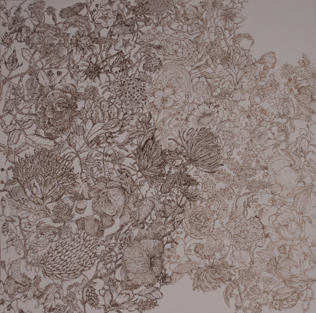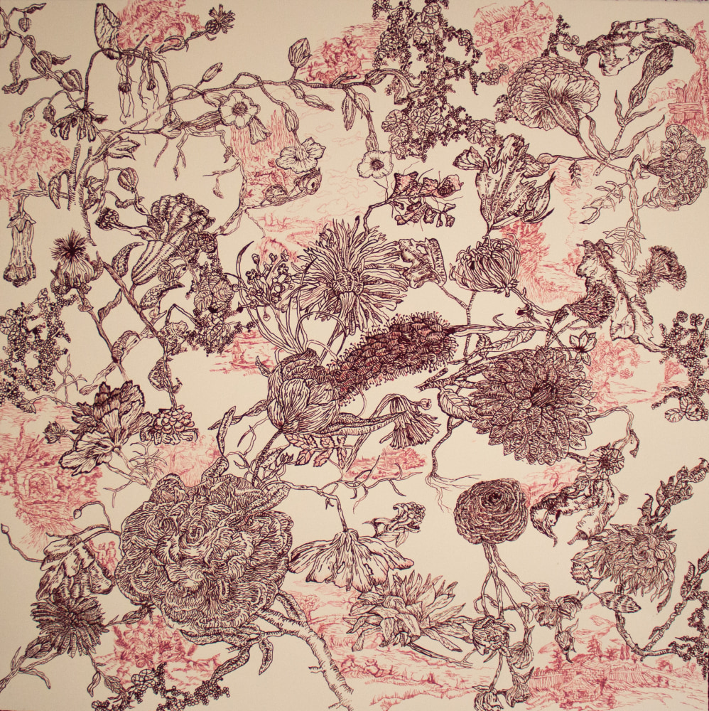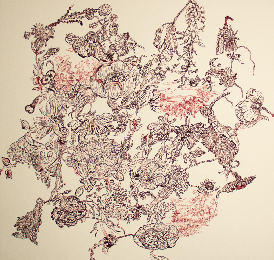 Two overriding themes in my studio work have been a commitment to narrative and an infatuation with outdoor settings. These recent paintings do not vary from this but more fully investigate the latter, focusing on land and foliage. The romance of landscape as evidenced in the work of French rococo painters, Audubon’s birds and animals, forest still lifes, and older botanical illustrations is one springboard for these pieces, with a hint of autobiography as I am a gardener. While there is no clear narrative the land masses (islands?) would seem to be a good sites for the dramatic action of nature. My work is revelatory; I rely on sketchbook drawings generated intuitively as the beginning of a series. The further development of these images leads me to a fuller understanding of underlying themes.