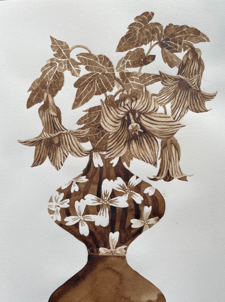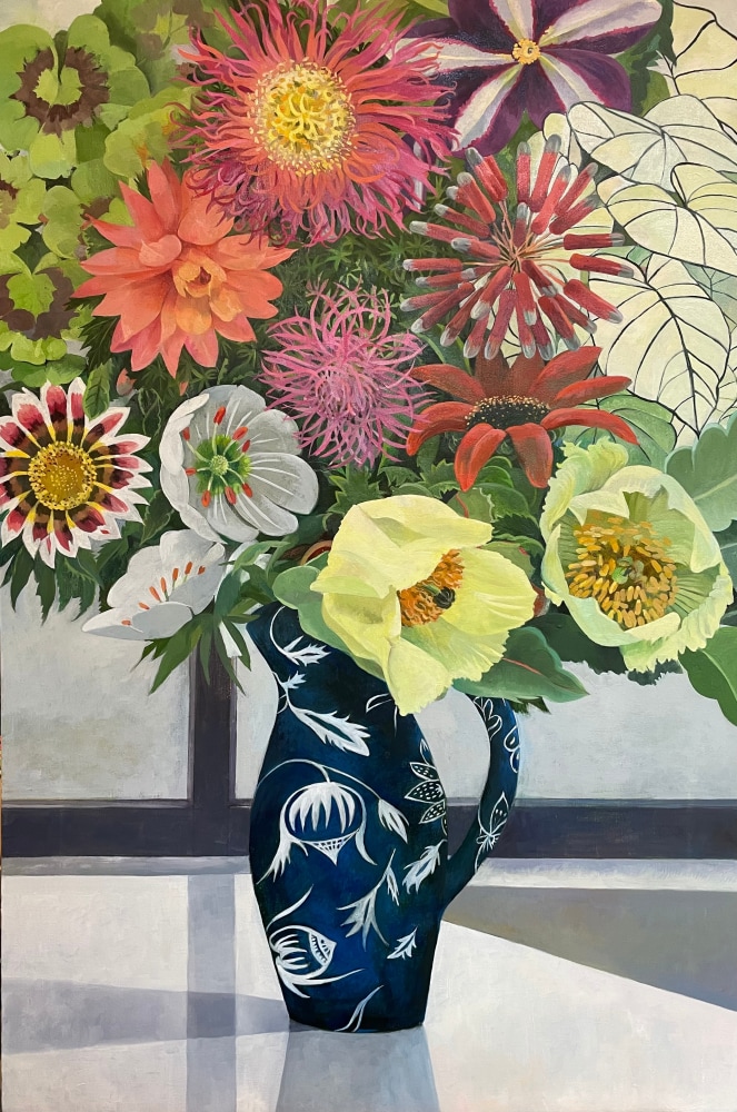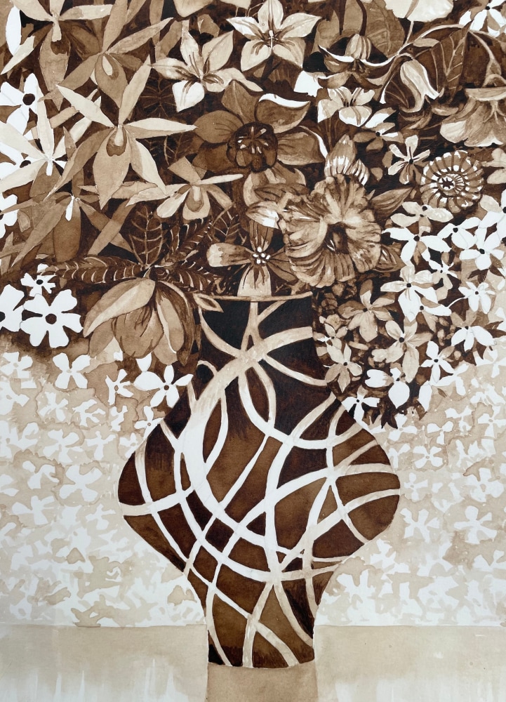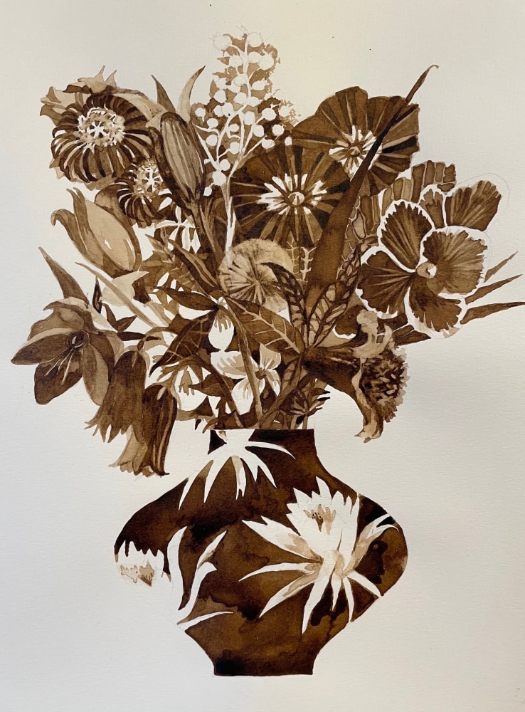 Susan Cohen draws inspiration from nature’s infinite variety and patterns. In vibrant oil and monochromatic walnut ink, her paintings combine observed and imagined reality through a keen, unsentimental lens. Often drawn to complex, highly structured blossoms, her subjects become intricate silhouettes, strikingly set against a spare background. Ribbons of contrasting lines adorn many of her vessels which are presented as abstract fields of looping light and dark. Cohen received her MFA in painting from Brooklyn College, where she studied with Lennart Anderson, Philip Pearlstein and Lois Dodd. Her works have been exhibited throughout the United States and can be found in the collections of the US State Dept/PRM Bureau, as well as corporate and private collections. She was a resident artist at the Vermont Studio Center, the Virginia Center for the Creative Arts, and Cummington Community for the Arts. She currently lives in New York City.
