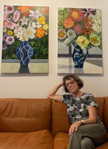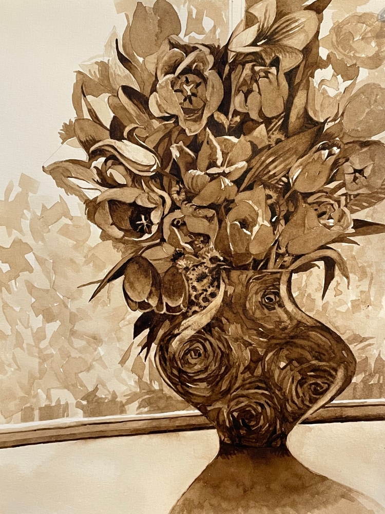 I am inspired by nature’s incredible variety and exquisite detail. In these paintings in oil and walnut ink, I paint flowers and still life, using a combination of imagination, observation, memory and reference photos. These paintings are a departure for me, in that I have extended my approach to painting beyond the faithful representation of an arranged still-life. Many of the historic and contemporary paintings I admire are depictions of objects, landscape, interior space, and light, in a context that is both imagined and respectful of observed reality. As I continue to investigate this way of working, I am discovering the freedom I was looking for, and an open door to continued invention.