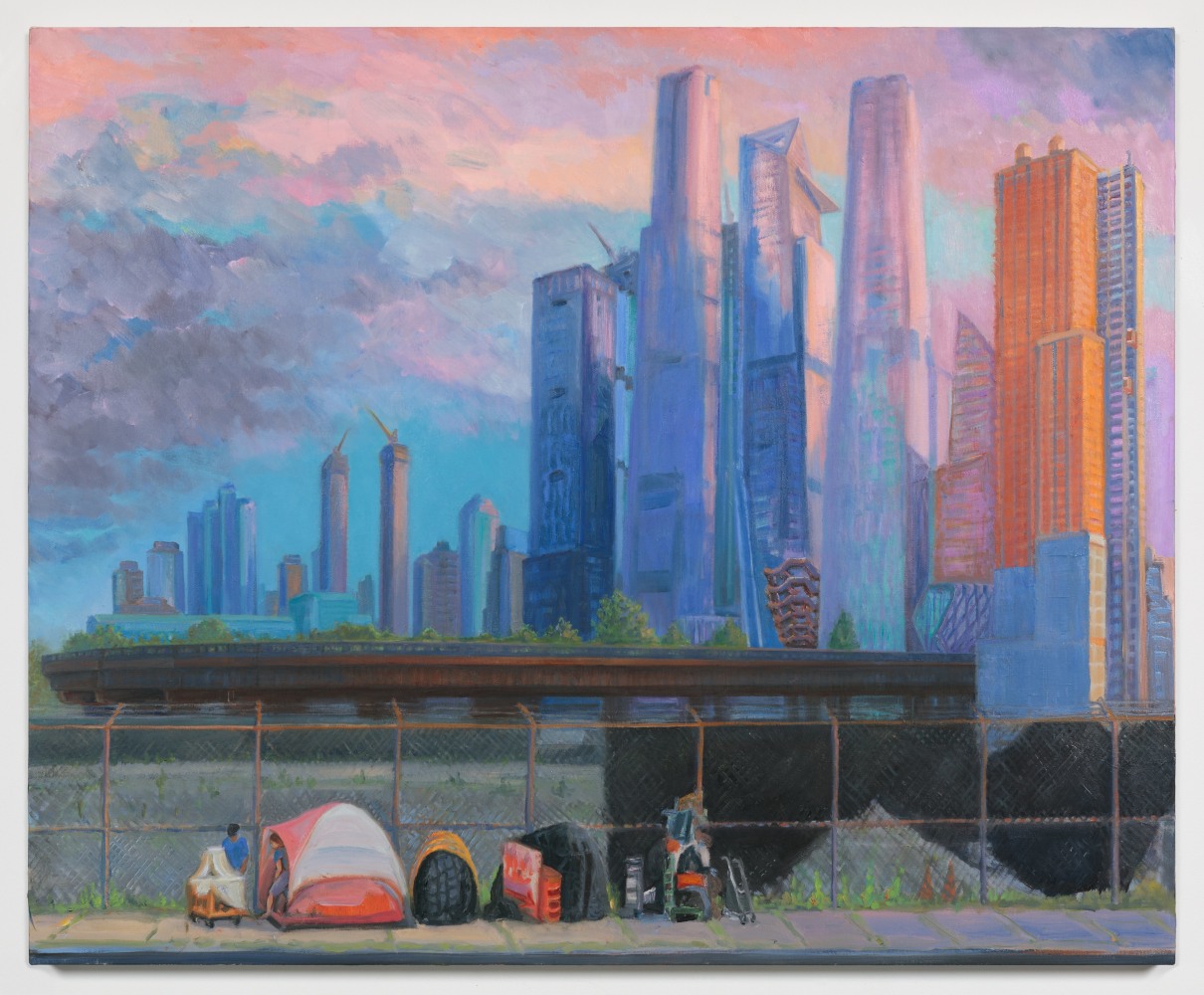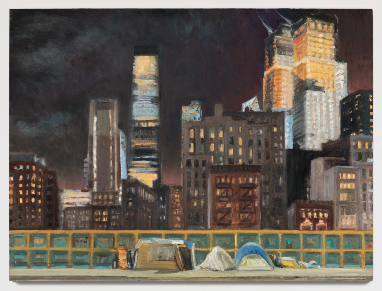 Leech does not only give primacy to the skyscrapers, broadening her scope to celebrate the inner structures as well as the cranes, scaffolding, and temporary machinery that raise them. Complex grids of rising steel columns and beams make up the skeletons of fledgling skyscrapers. Scaffolding and netting cast a labyrinthine pattern over the emerging sleek and imposing edifices. Despite their immensity, the internal supports and auxiliary architectures carry a sense of ephemerality. Their visibility is only temporary - they will be concealed or disappear as suddenly as they have arrived. Leech’s interest in temporary structures shifted during the early days of the pandemic, moving from tall, aerial structures to encampments of displaced peoples forming in the shadows of halted projects. Leech’s parallel “skylines” emphasize the fragility of these shelters, shifting her vision of the city from epic to imposing.