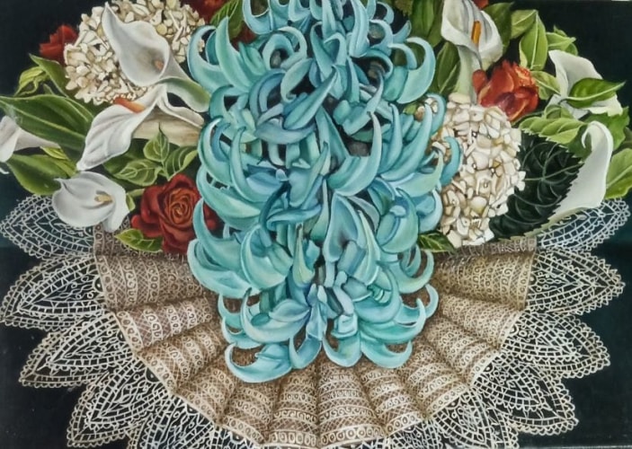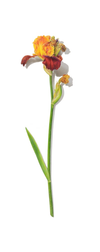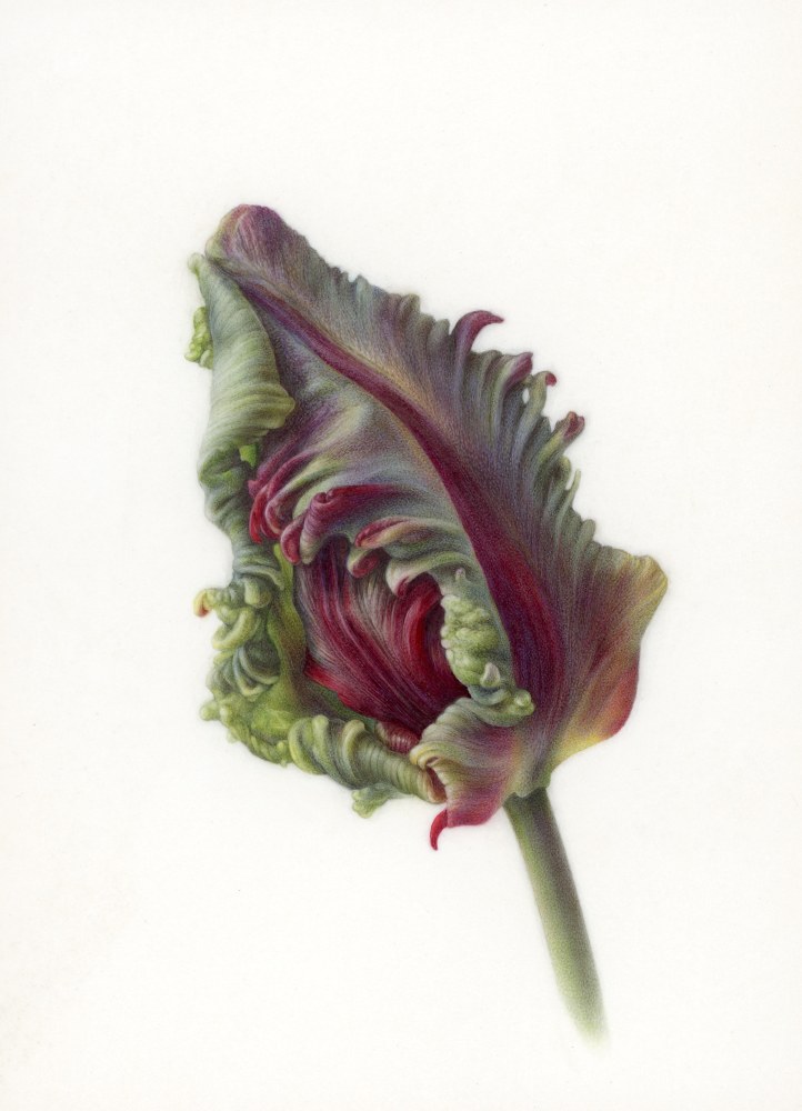 Meticulous, nuanced petals and sensuous stems belie the ubiquity of their subjects, and gesture towards the deft hand of their makers. Whether miniature or grandiose in scale, these floral icons are utterly ecstatic. Margot Glass’s delicate graphite and goldpoint dandelions and Dina Brodsky’s diaristic trees are byzantine meditations on impermanence and memory. Miriam Escofet (recent recipient of the BP Portrait Award) and Grace Devito each bring their background in portraiture to their floral still lifes, capturing the subtle nuances and individuality of each bloom. Eric Wert, Amy Laskin, and Marina Kiselyova celebrate the opulence of their blooms with lavish and decorative detail; conversely, Jordan Wolfson, Tyler Swain, and Melanie Parke each bow to the humble simplicity of their botanicals. Christopher Adams explores adaptive radiation with ceramics, and Sarah Phillips arranges her specimens into kaleidoscopic patterns, rendering their quotidian subjects surreal and exotic. Jose Escofet’s oil paintings are similarly punched up and surreal. A bouquet of fragile monoliths, Frederick Brosen’s watercolor blossoms are feats of gentle precision, L.C. Armstrong’s bomb fuse paintings are laced with an element of danger, Tim Nighswander’s amaryllis photographs are modern memento moris, and Brandy Kraft’s oil paintings are portrait-like in their hybrid specificity. David Morrison and Mary Reilly’s hyperrealist colored pencil and graphite drawings are charged with a sense of intimacy and rigor, while Jimmy Fike achieves the same effect through his objective, almost scientific lens.