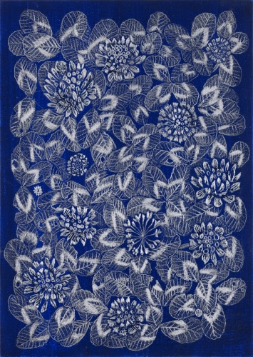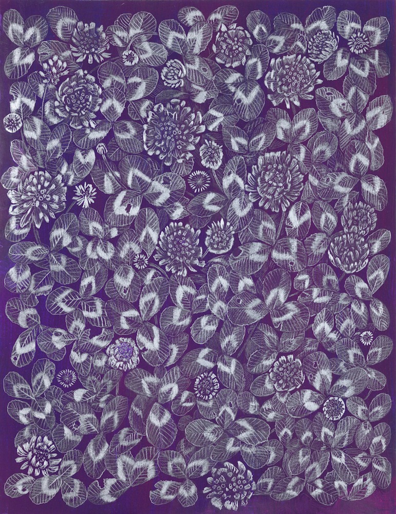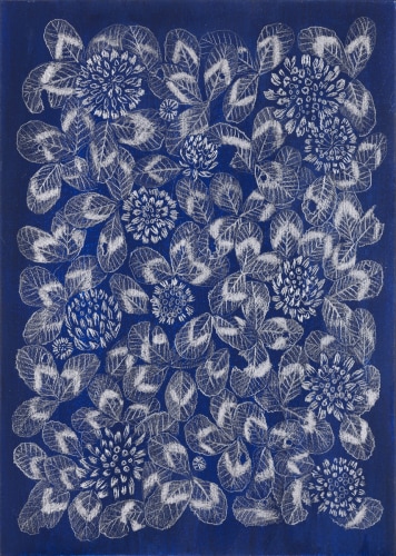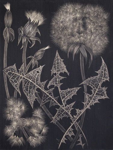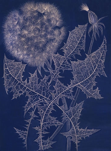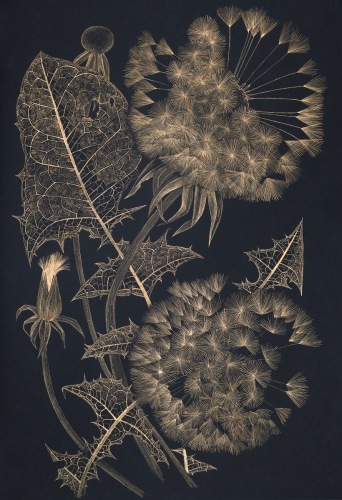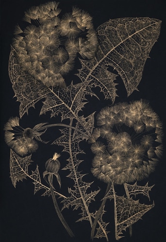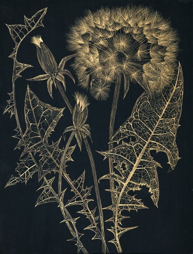 The artist’s training as a gilder is the foundation of this body of work. Her process requires an almost physiological slowing down: the hand, the lungs, and the mind must all reach a meditative state to complete this delicate work. This coupling of duration and ephemerality fills Glass’s drawings with a sense of timelessness; they are at once present here, as well as in a deep and distant past. Additionally, dandelions, geraniums, and chicory all appear in various states of bud and bloom, indicating the life cycle of the plants. There is a narrative of birth-life-death-rebirth implicit in her work. Though these plants are indeed vulnerable, the artist ensures that their death is not understood as their ending.