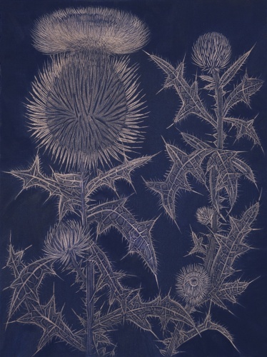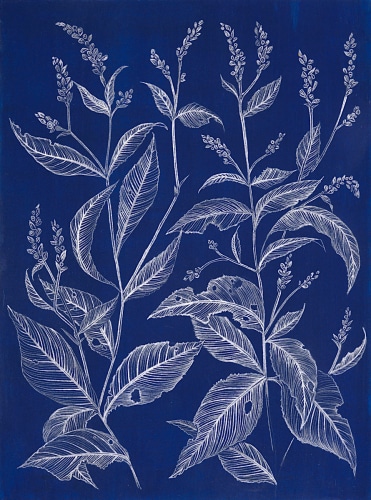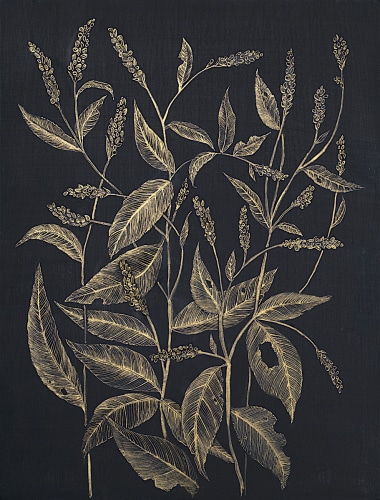 Margot Glass’s rendering of detail demands close attention. Her play with positive and negative space—the almost imperceptible shade of translucence between leaf veins, or the rich puff of a seed head—draws her viewer into a close embrace. Space and matter interlock not only within her diaphanous specimen, but amongst them as well, plaiting together into a single organism. Though her drawings exist outside the realm of illustration, Margot’s consideration of light and light effects gestures towards her subjects’ wild origins. In the way the sun’s shifting position alters the appearance and silhouette of a flower, so does the glimmer of Margot’s gold and acrylic lines as the viewer changes their vantage point.