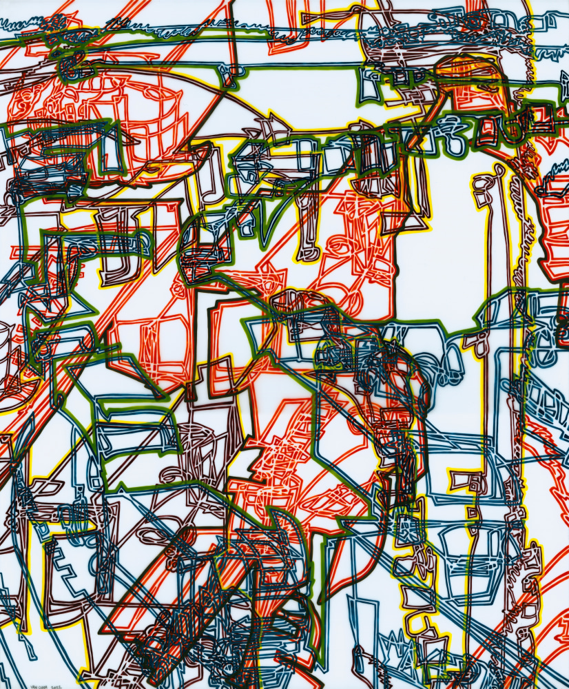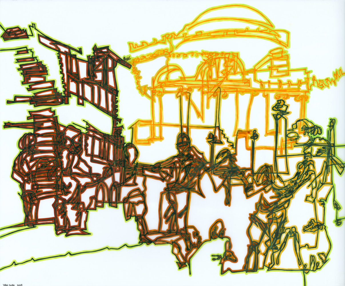 Because of the spontaneity of her blind contour technique, Van Cura’s lines range from deeply incised, to wobbly and almost fragmented. Layered and repeated in mixed mediums onto translucent film, they knit together to form complex networks of forms and cross-currents of energy. This array of media allows Van Cura to play with the character of her lines; marker and acrylic ink form thick, galvanic strands of color, while graphite lends itself to more frenetic hatch marks. This interplay of linework, occasionally offset by diaphanous watercolor, creates a sense of dimensionality and disorientation. These scenes are not flat or static, but ones of action and volume.