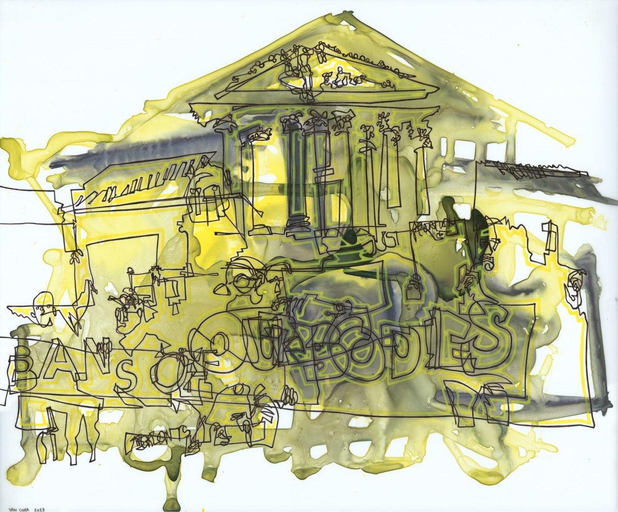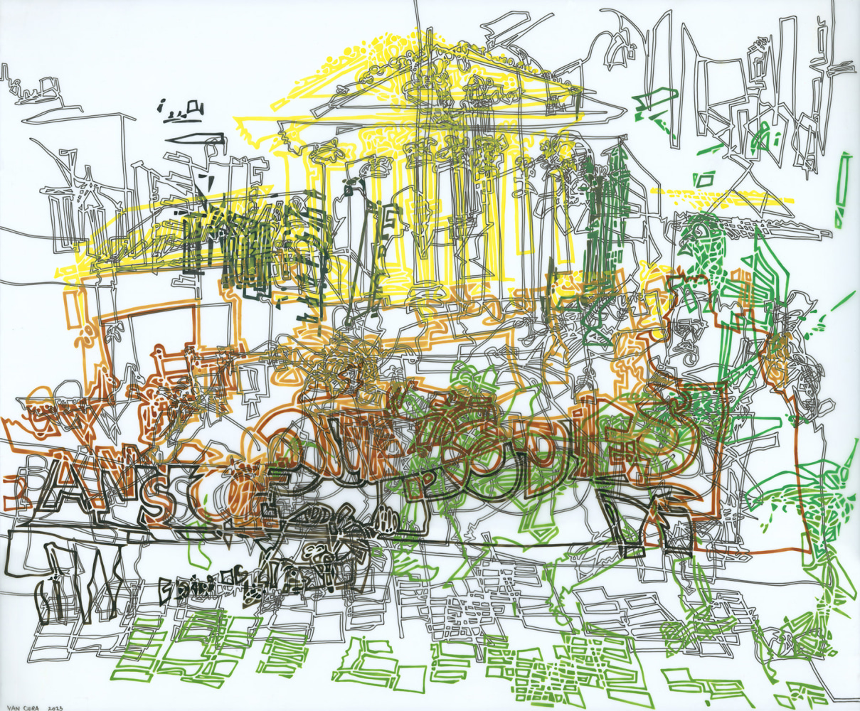 The murders of George Floyd and Breonna Taylor, along with the overturning of Roe v. Wade, serve as powerful catalysts for Marjorie Van Cura's striking drawings, which are inspired by photographic images of the subsequent protests. Her process begins with a blind contour drawing of her subject. This process teases out salient anchor points and compositional features of her source material. Her sketches distill the most poignant gestures, becoming highly concentrated versions of their predecessors. As a result, the movement and images in Van Cura’s work takes on their most elemental, almost iconic forms. Though abstracted, the energy of raised arms, the impact of text across banners, and the gravity of government landmarks emanates from her confusion of linework. By isolating and intensifying these motions, Van Cura’s drawings capture the needs, desires, and fortitude of her subjects in their most heightened states.