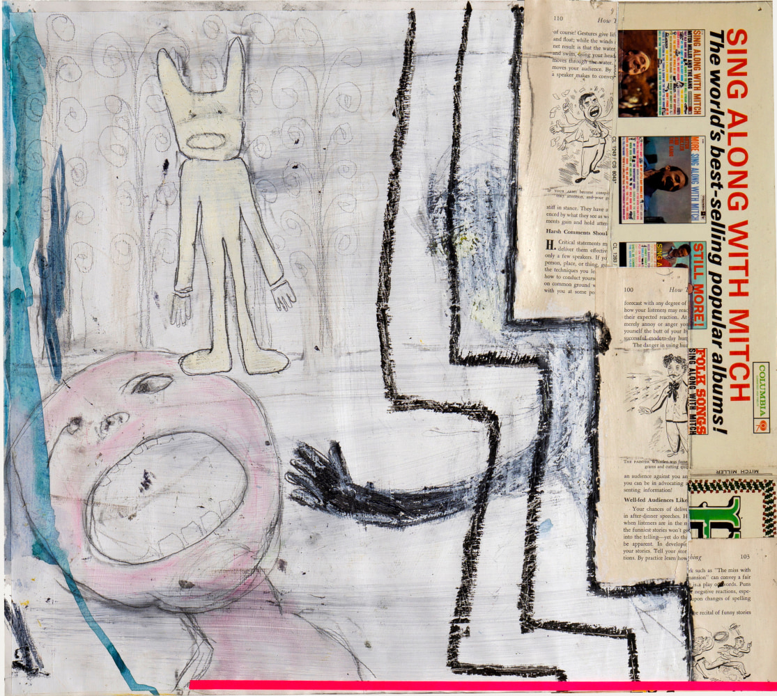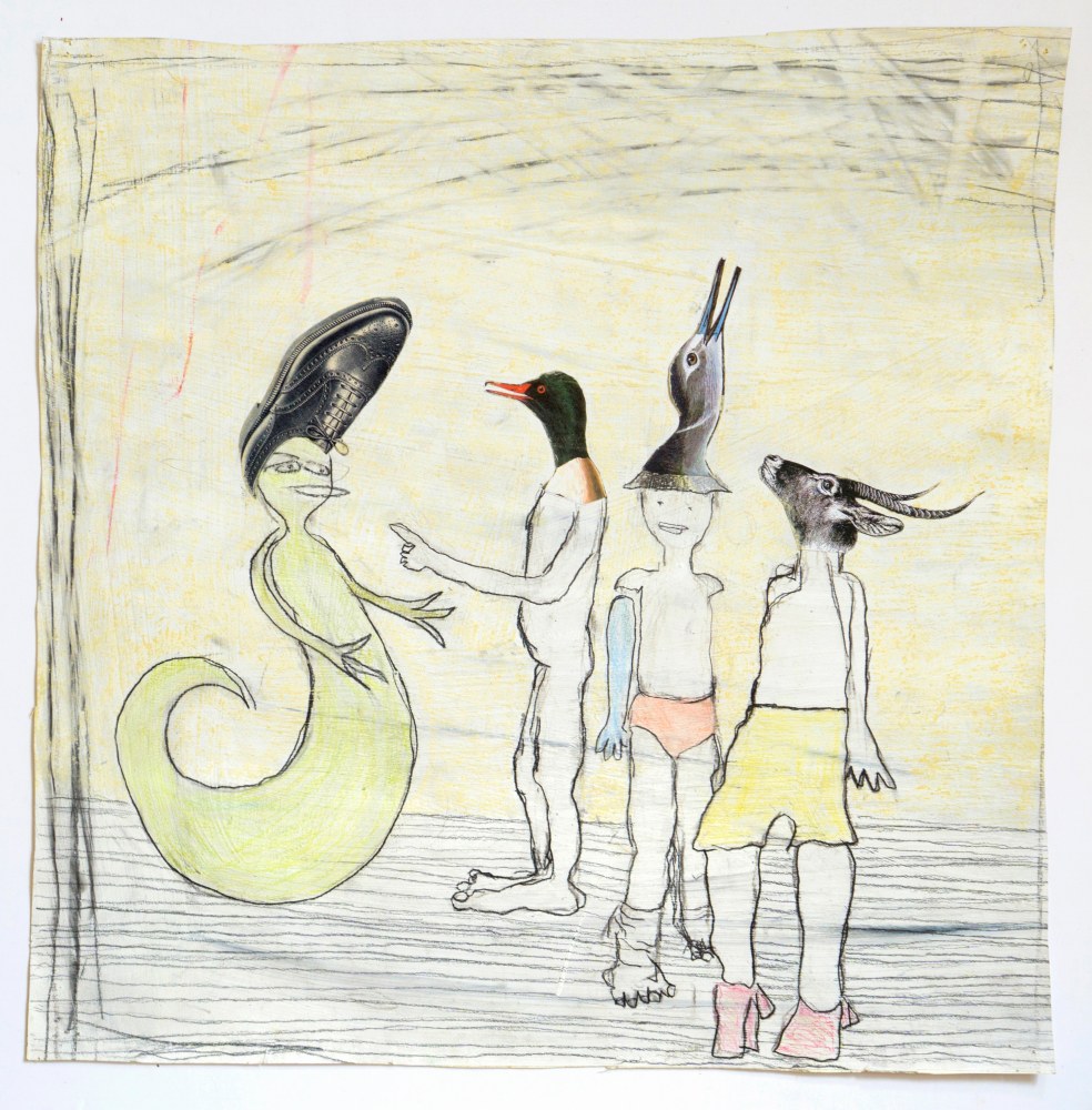 Psychological friction cross-cuts the artworks in Chat & Chew. Stern imbues her figures with histories and opinions, filling their mouths and minds to the brim with dialogue. Subtle weight shifts and postural asymmetry reveal relationships and ambivalence not only between figures within the same pictorial plane, but also beyond compositional boundaries. Never one to be deterred by the edge of panel or paper, Stern allows her figures to stare and often reach out to one another, weaving a network of narratives amongst the works. Taciturn and furtive figures cloak themselves in the cacophony of their peers. Fragments of dialogue are whispered by mouthless faces and unmoored limbs; deep wells of inner monologues that counterbalance external chatter. And at the same time there is refined sense of equilibrium and elegance in the artworks. Stern reflects, “this creative tension, this ambivalence about my relationships– to myself and those with whom I am close– expresses itself in every piece of art I make, and every day that I make it. I grapple with duality in a kind of tag-team wrestling match with myself; but look at the upside–even when I lose, I always win.”
