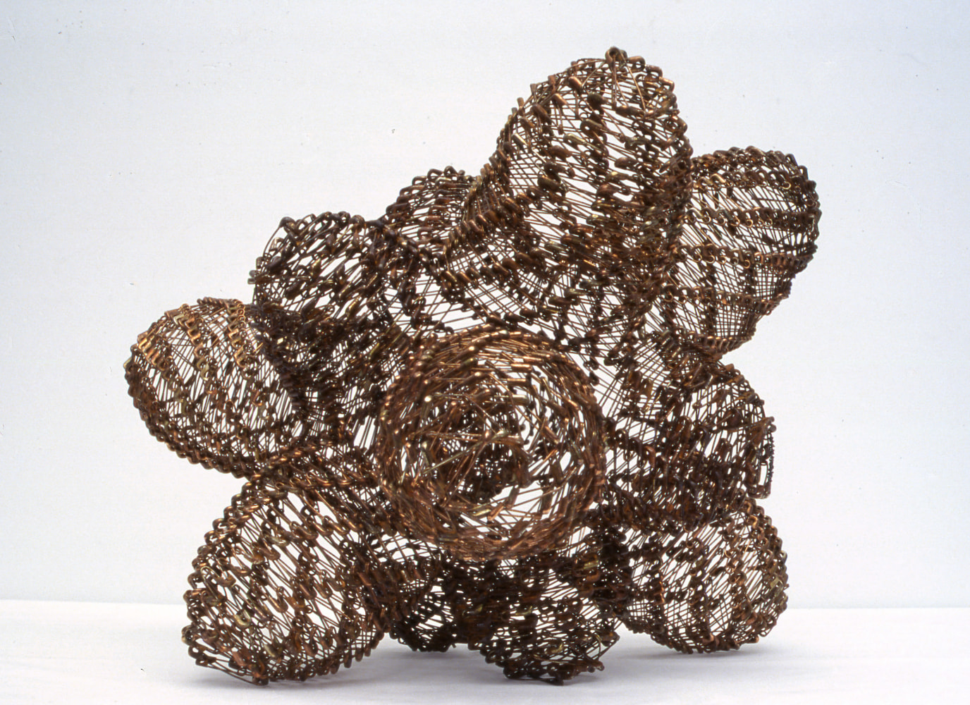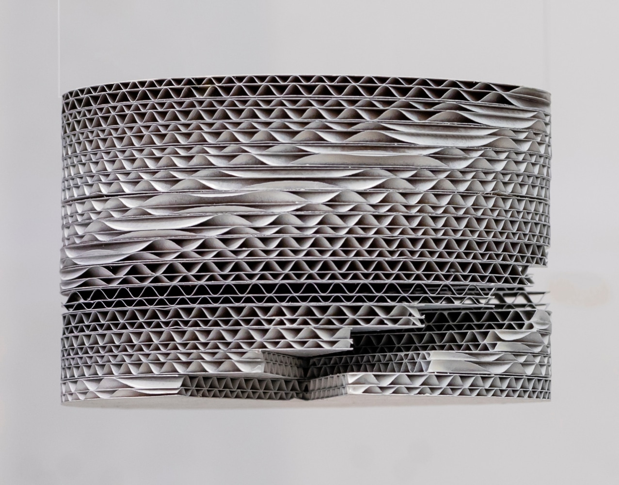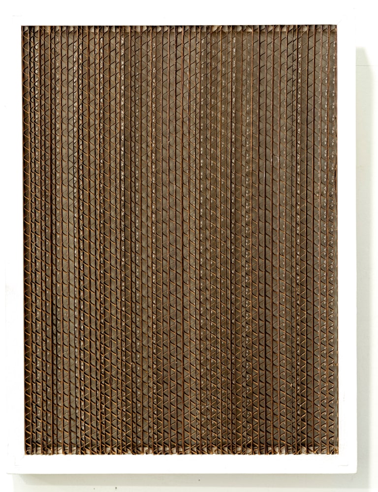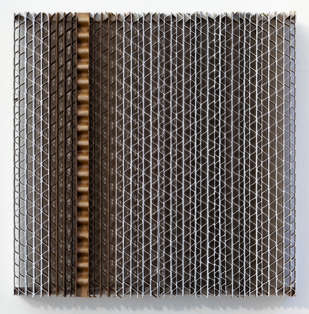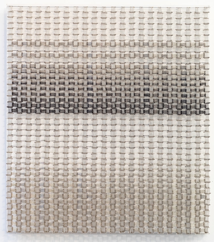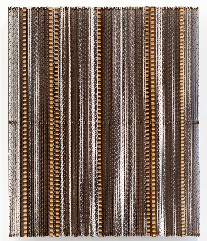 In this most recent body of work, Kawata weaves her signature safety pins to create objects of fantasy and minimalism. Transformed by volume and manipulation, the artist elevates these humble materials from their prosaic, utilitarian roles and endows them with elegance and grandeur. Transformed into wall-mounted, free-standing, and hanging works, these ubiquitous items become the actual surround. In addition to pins, Kawata introduces corrugated cardboard and paperclips as other prominent materials in this exhibition.